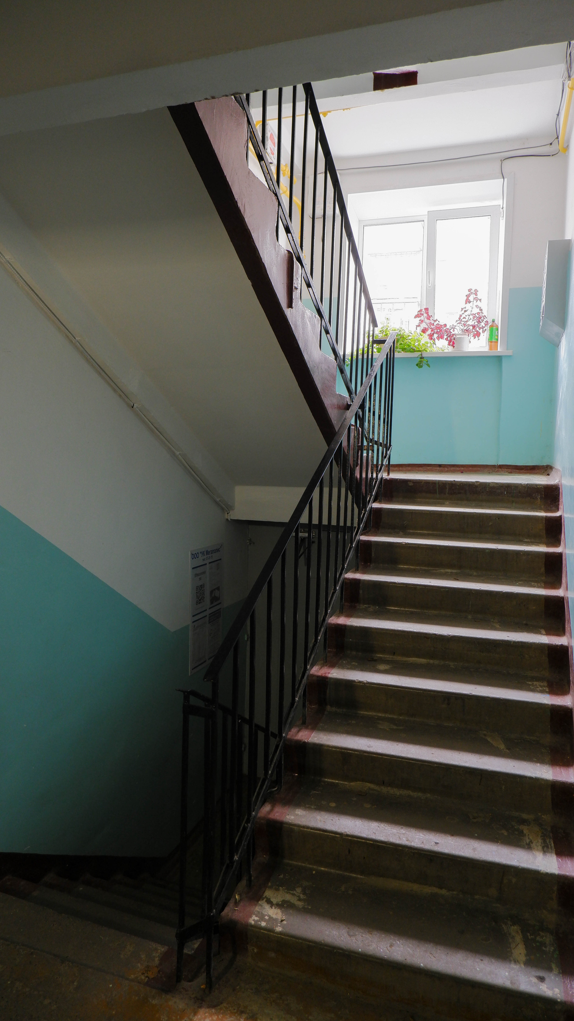 Расположена на 1 этаже, который фактический является 2 (вторым), так как окна располагаются на уровне второго этажа, а внизу находится детская спортшкола.