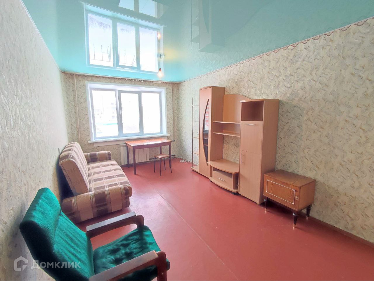 На полу покрытие - линолеум, потолки - глянцевые натяжные
