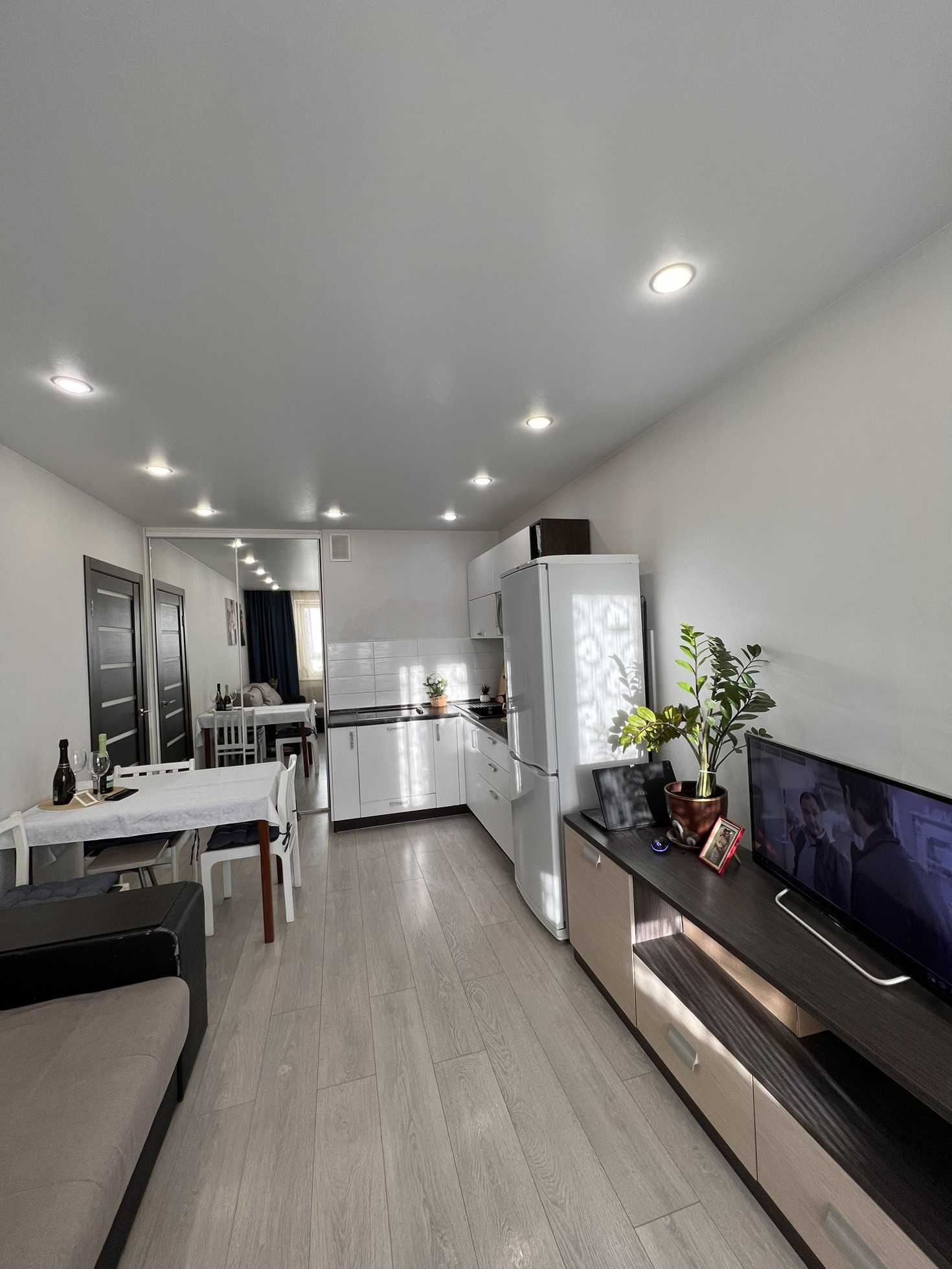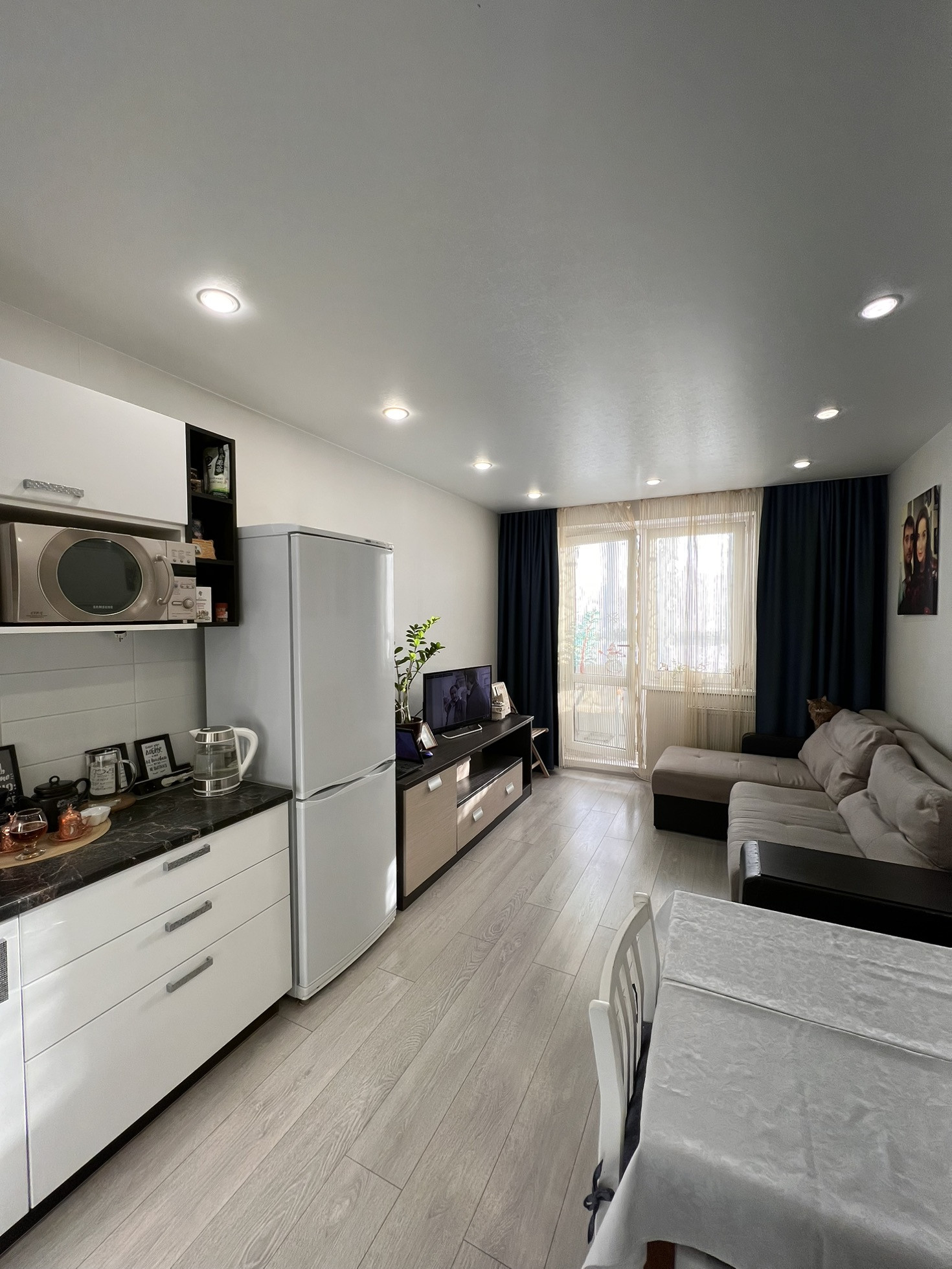 Отличное состояние. Хороший ремонт в нейтральных светлых тонах. Великолепная планировка. В этой квартире Вам будет приятно находиться. Две просторные комнаты, одна из которых кухня-гостиная с выходом на уютный балкон.