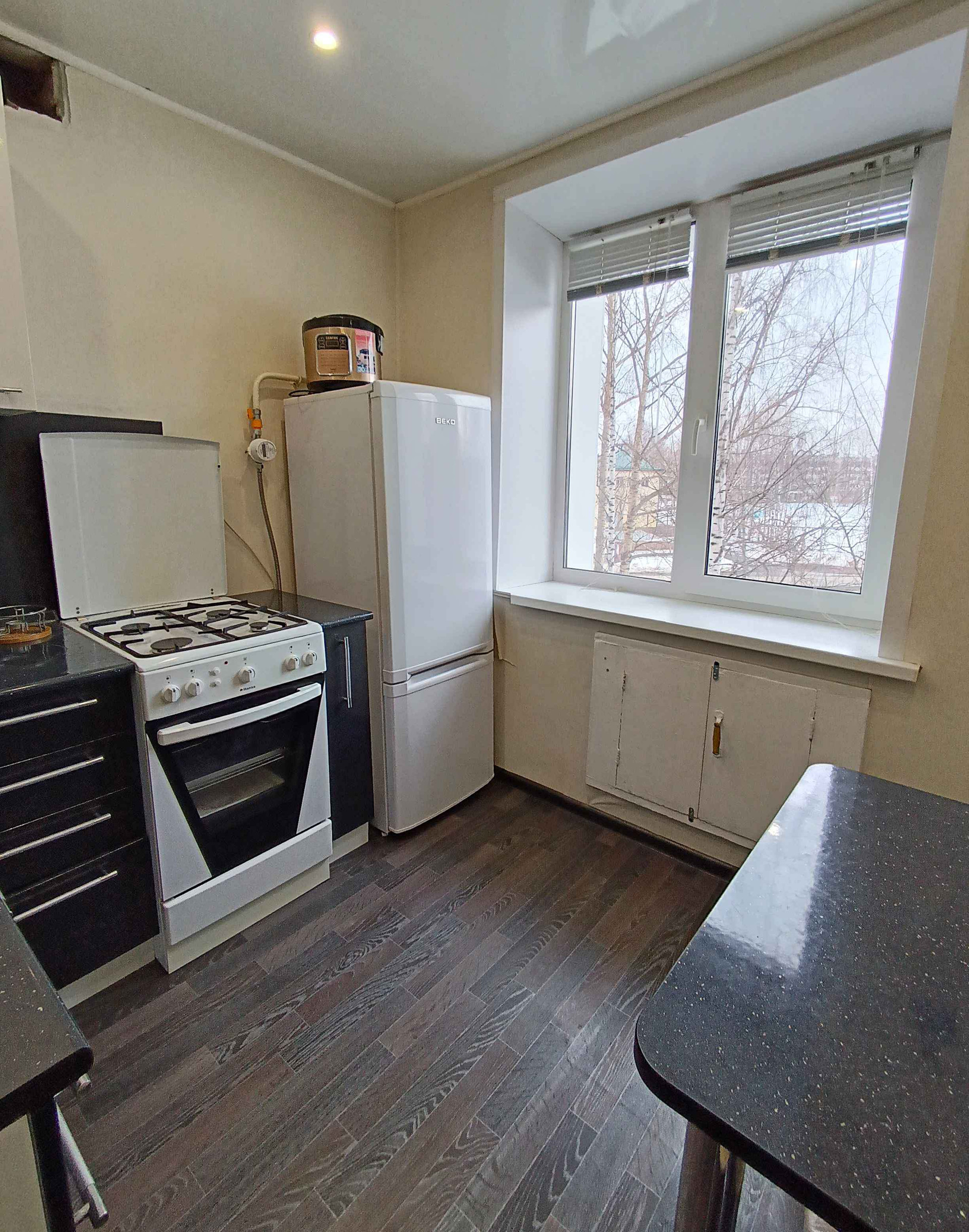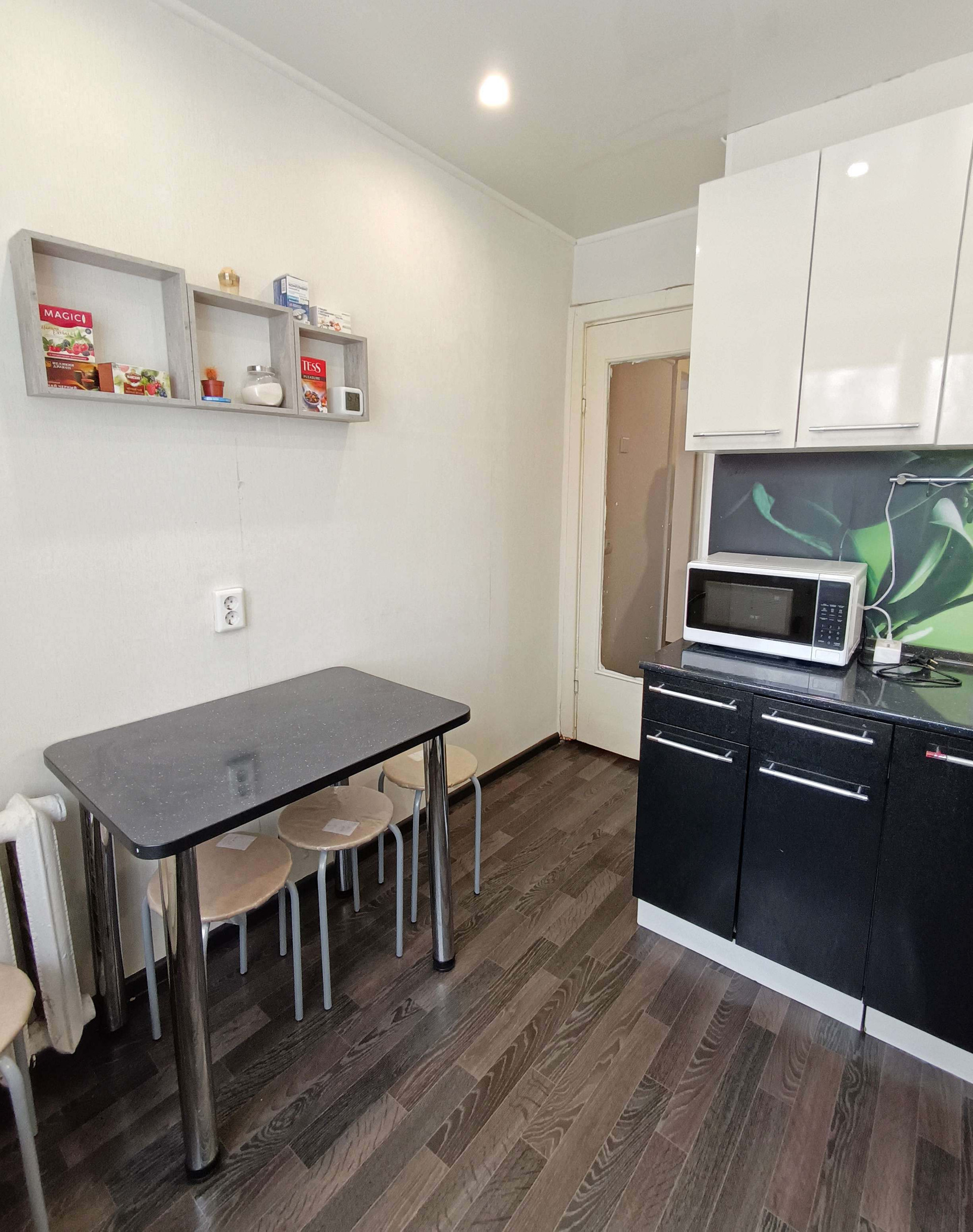 Площадь кухни 6,1 кв.м., на кухне остается хороший кухонный гарнитур, на полу-линолеум, есть газовый счетчик.