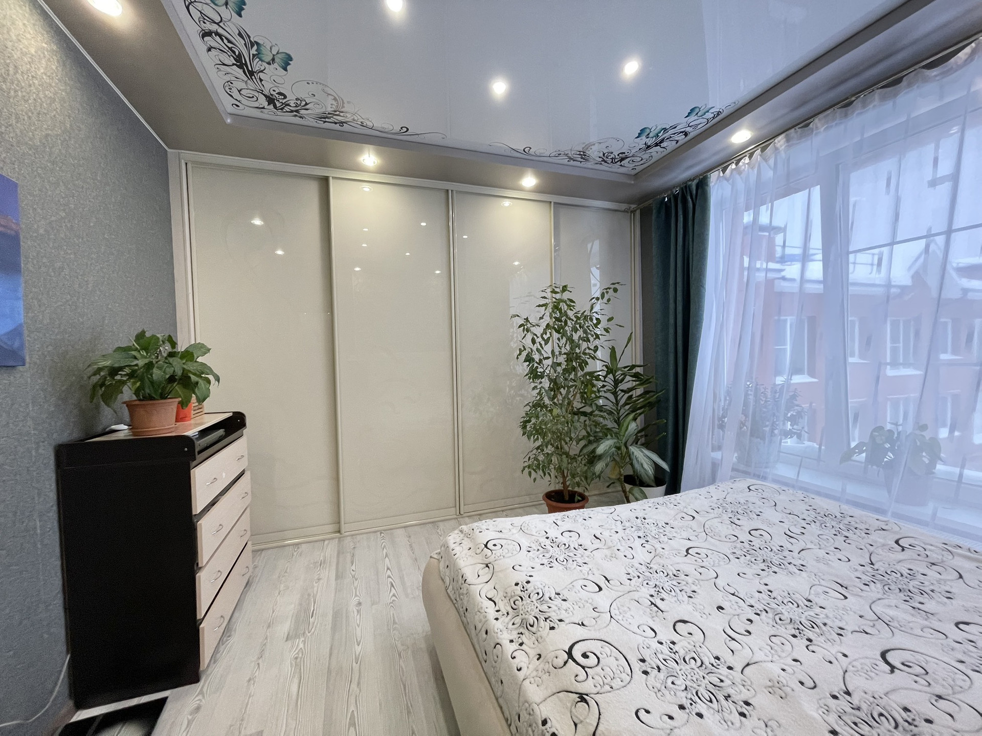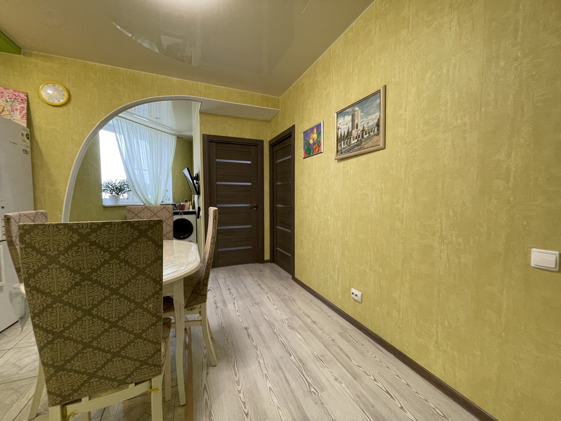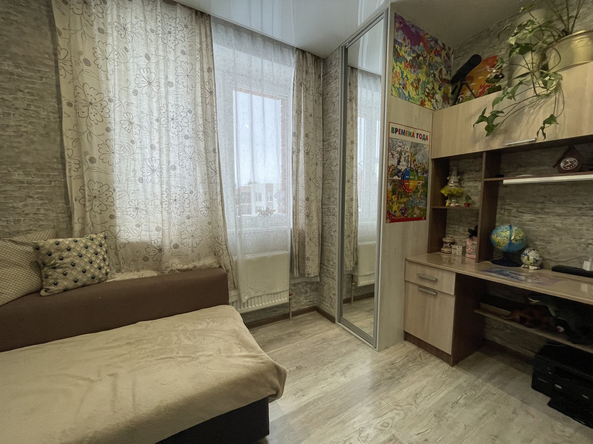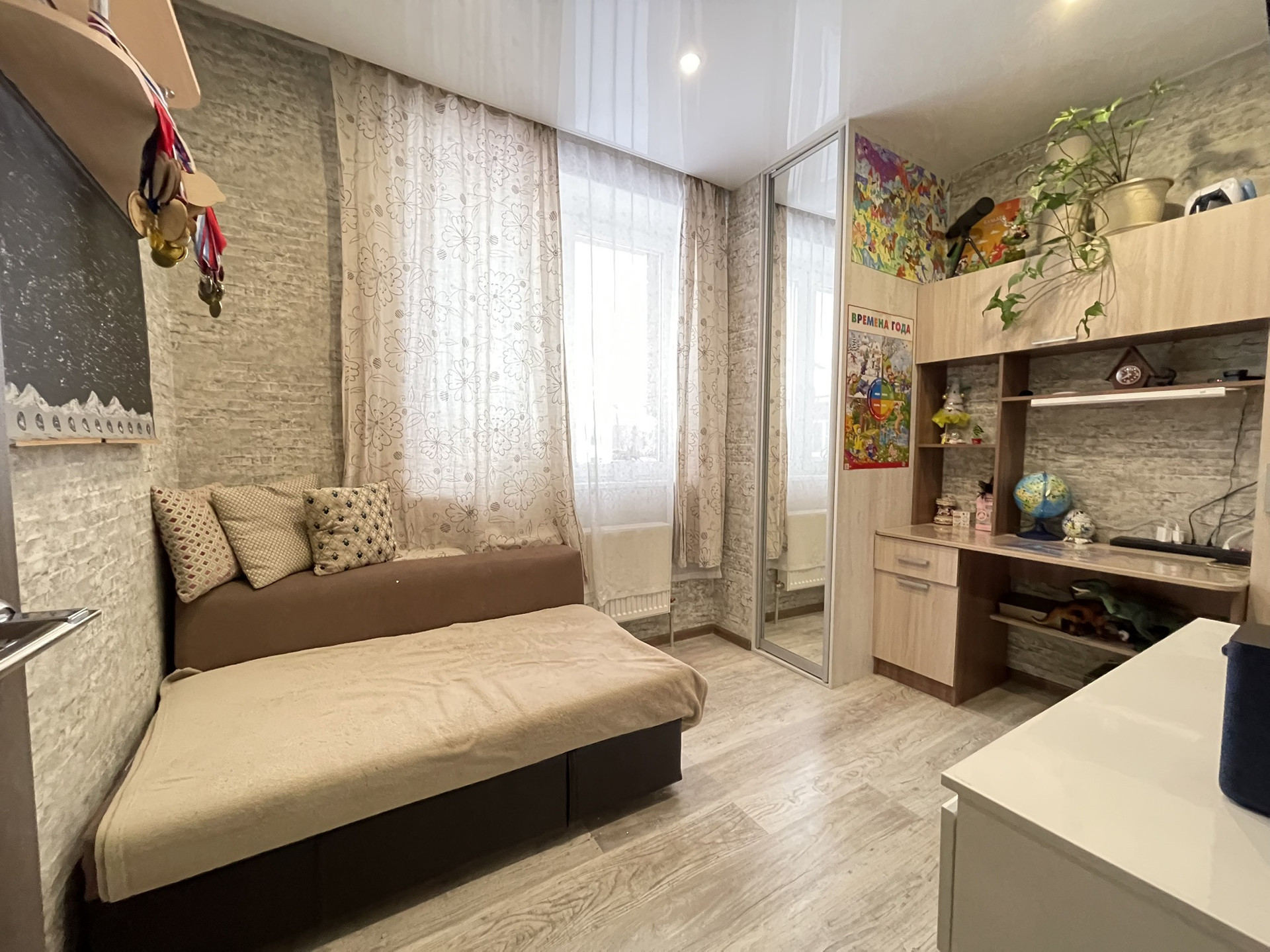 Квартира формате Евро четыре 59 кв.м Расположена на 3 этаже. Из окна квартиры открывается красивый вид на лесной массив. Квартира светлая, чистая, очень теплая с индивидуальным газовым котлом. Планировка квартиры очень удобная и функциональная. Квартира- распашонка. Кухня гостиная с небольшим аппендиксом ( можно сделать лоджию или отдельное место для сушки белья или просто отдыха — 16 м2 Спальня с большим шкафом (гардеробная) и панорамным окном — 15,3 м2 детская комната — 10 м2 детская комната — 9 м2 сан узел — 4 м2 В квартире сделан ремонт: на полу качественный ламинат, зона кухни и коридор керамогранит, стены ровные, поклеены обои, сан. узел в кафеле, качественная сантехника. Для вас бонусом остается качественный кухонный гарнитур со всей встроенной техникой; посудомоечная машина, вытяжка, варочная панель, духовой шкаф, диван. Большой шкаф купе в спальне заменит гардеробную. ПРЕИМУЩЕСТВА: