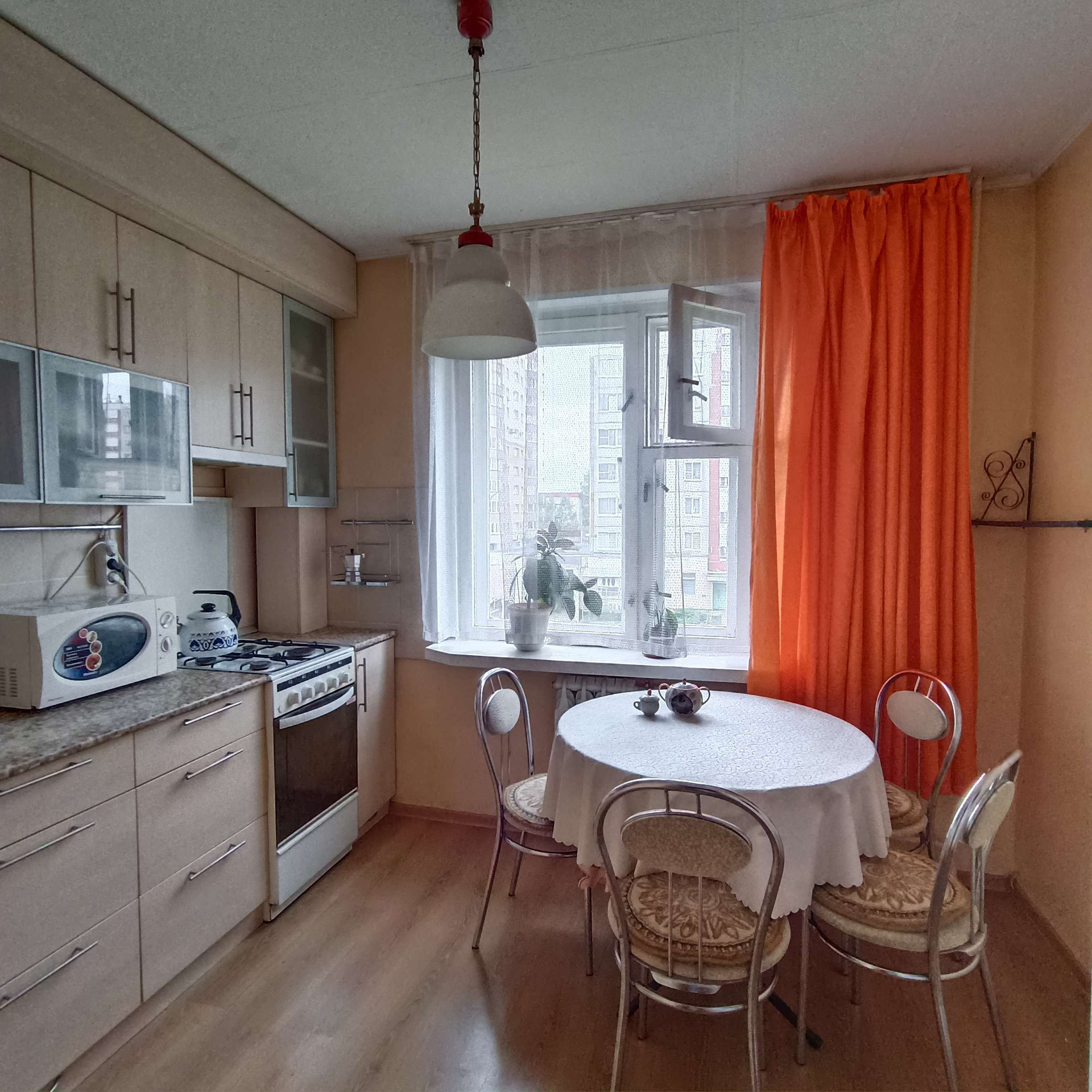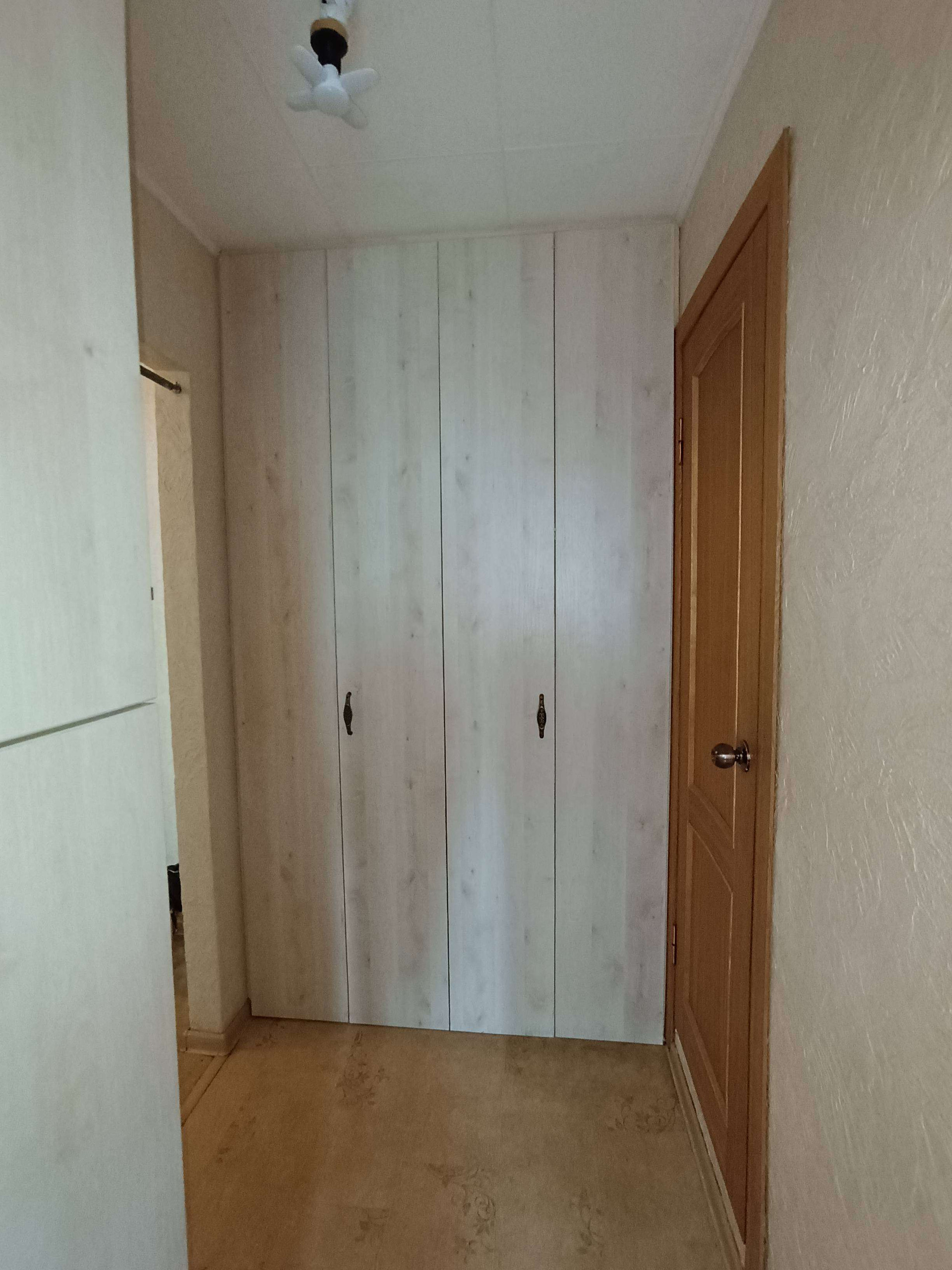 В квартире остаётся кухонный гарнитур с газовой плитой и вытяжка; встроенные шкафы в коридоре и шкаф-купе в гостиной.