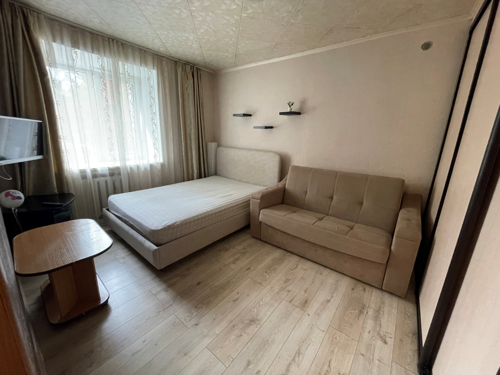 Общая площадь 30 м2, в том числе балкон 2,6 м2 (застеклен, обшит деревом). Окна выходят во двор. В квартире сделан ремонт. Отличный вариант для молодой семьи, студента или для сдачи в аренду