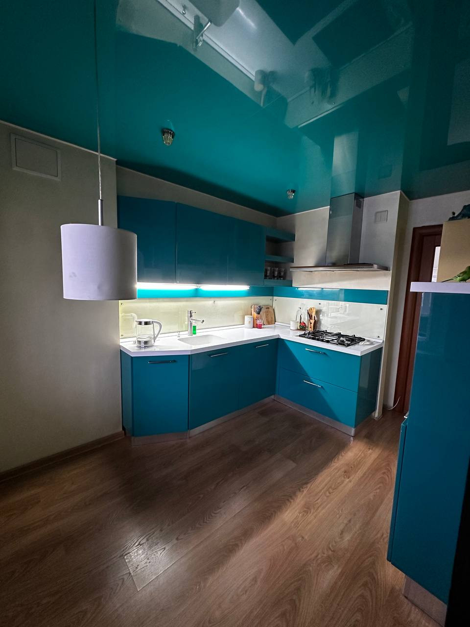 - На просторной кухне гарнитур Giulia Novars, каменная столешница с монолитной раковиной, большое количество мест для хранения, газовая варочная панель и вытяжка.