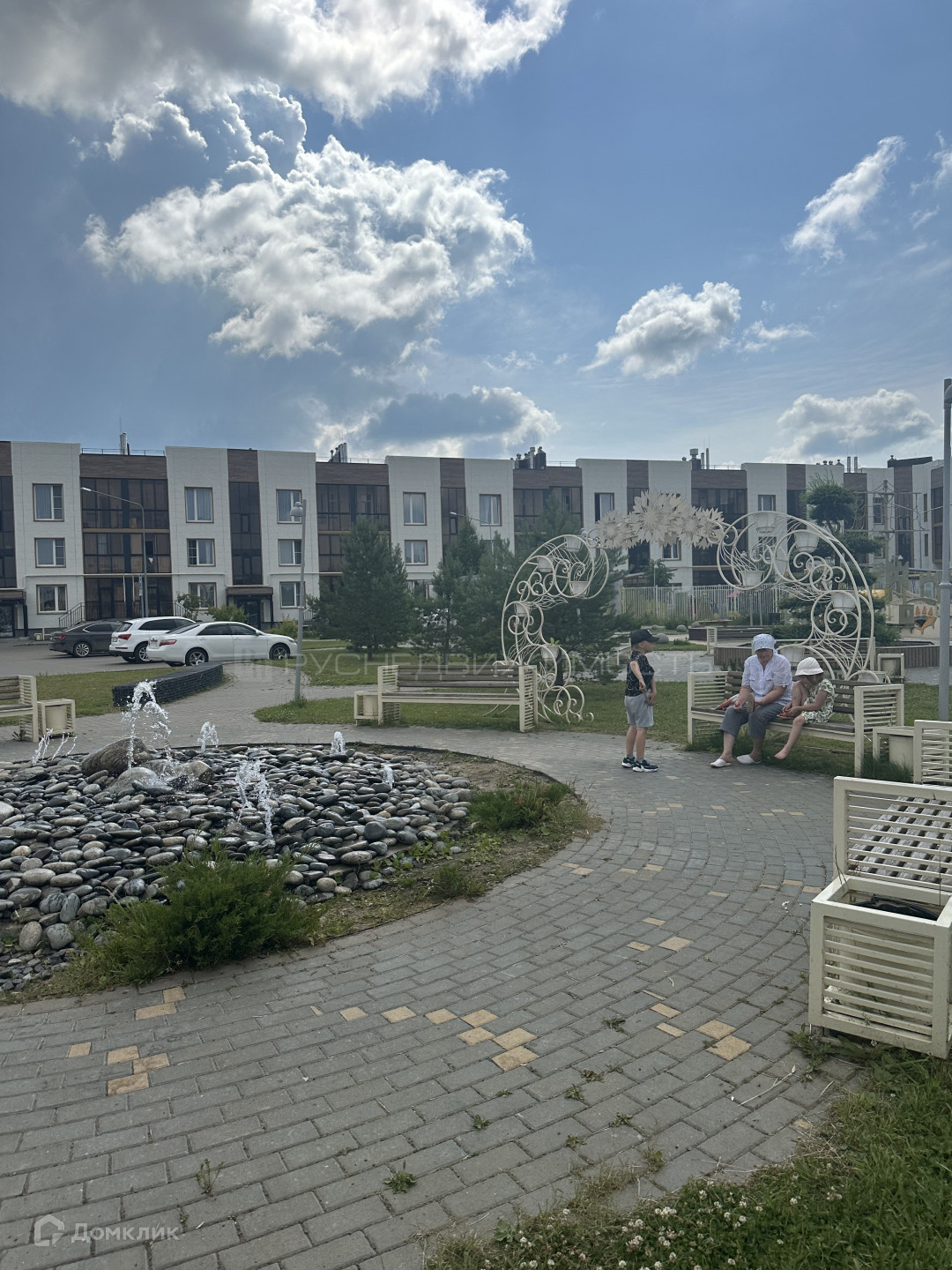 -фонтан и  уютные зоны отдыха с  разнообразными качелями и беседками для взрослых.