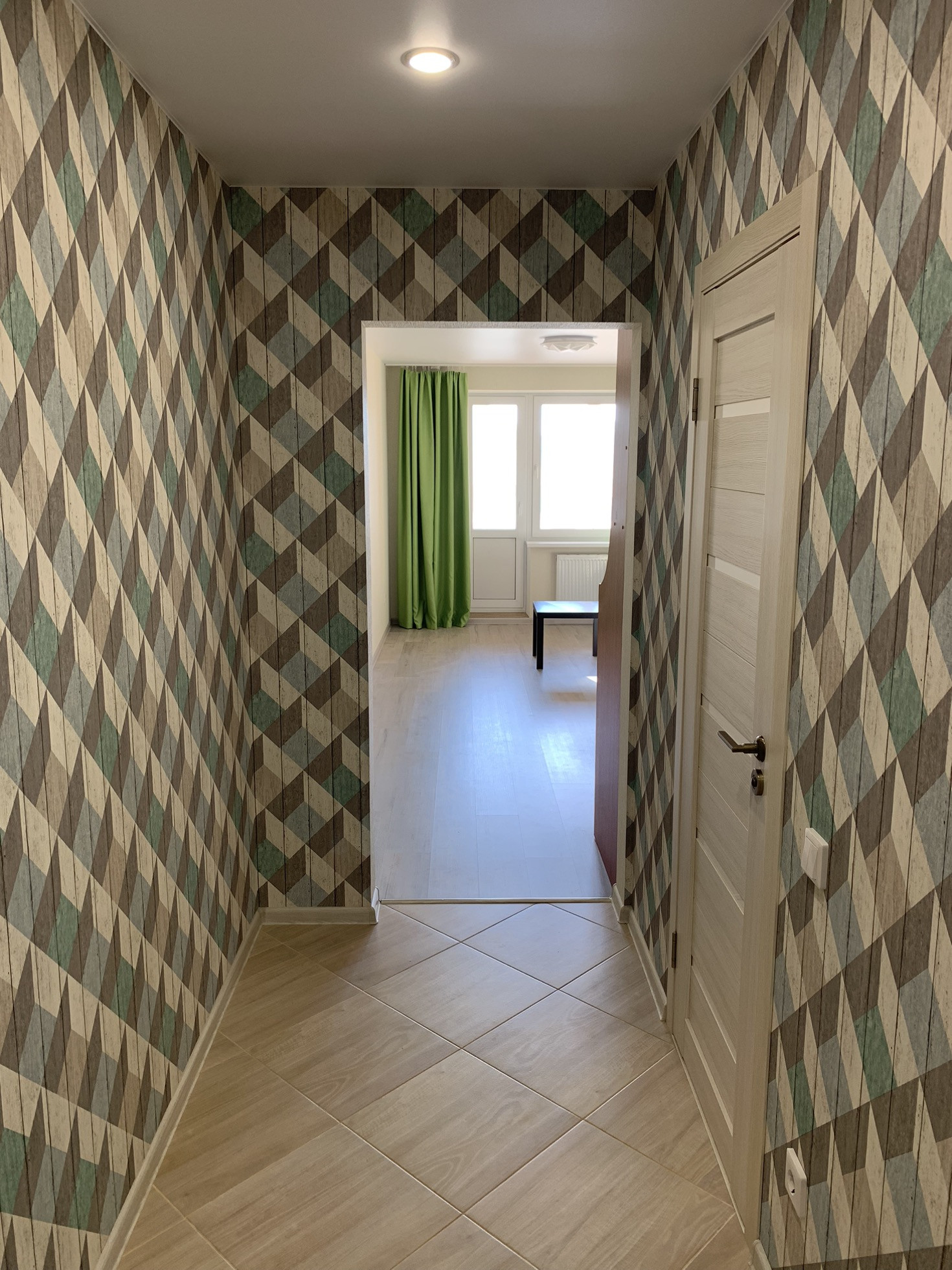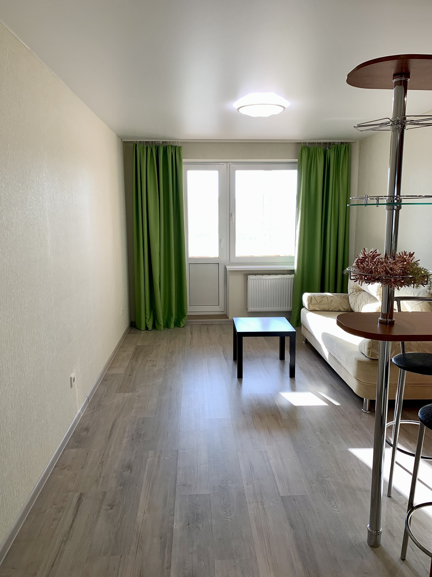 Состояние квартиры отличное. В квартире выполнен Евро-ремонт: ламинат, керамическая плитка, обои, натяжные потолки, стоят счетчики на воду. Кухонный гарнитур, диван, столик, все остается новым жильцам.