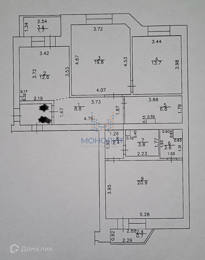 Жилая площадь 54.4 м2