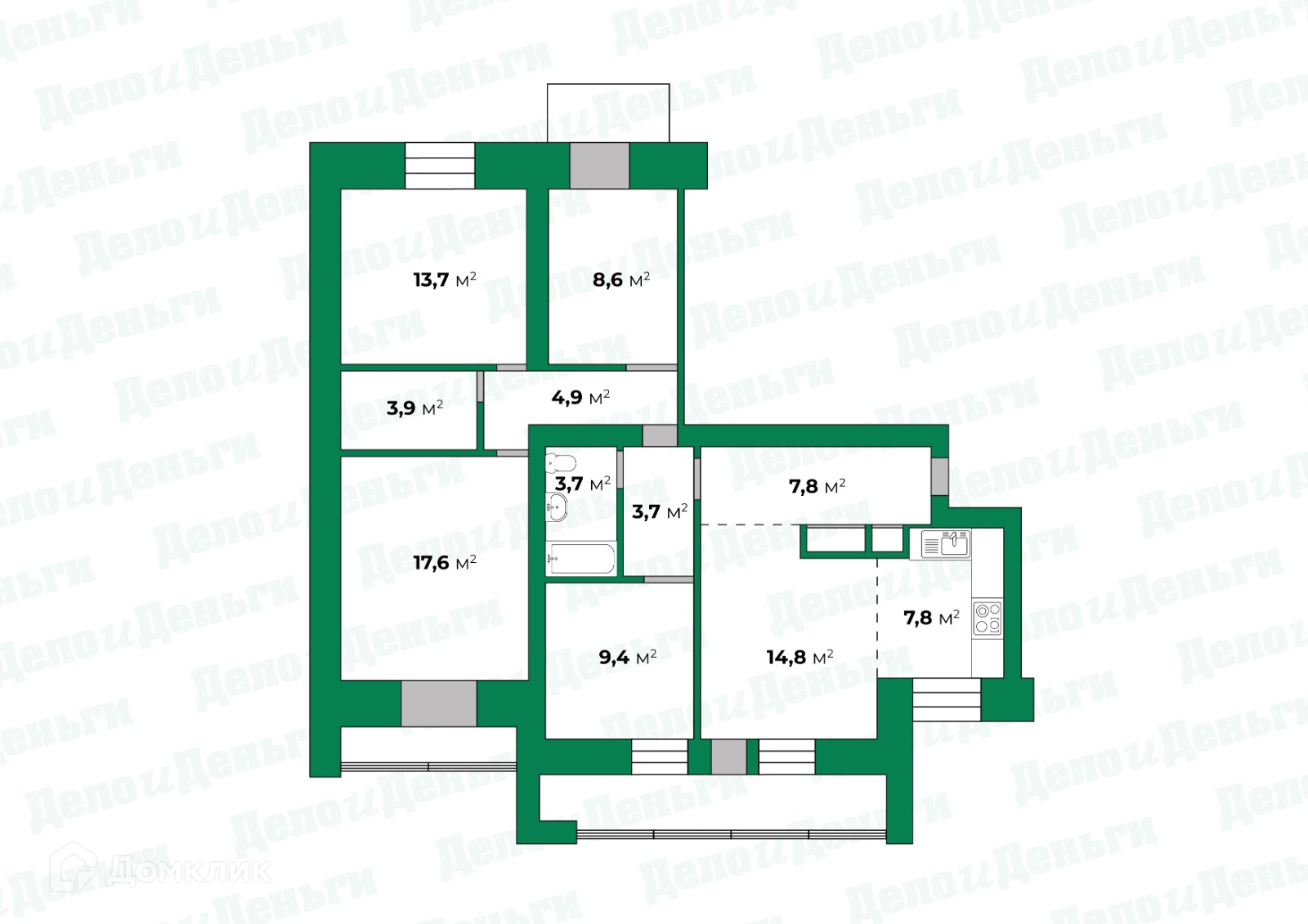 -3 спальни 17,6; 13,7; 9,4 кв.м