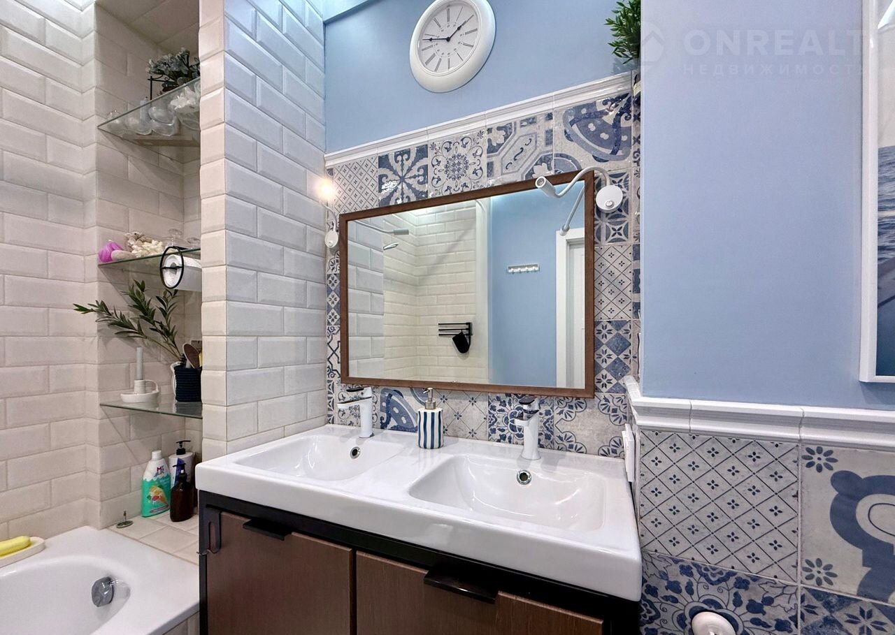 - Установлено зеркало с подсветкой и двойная раковина, удобство которой особенно отметит семья с детьми.