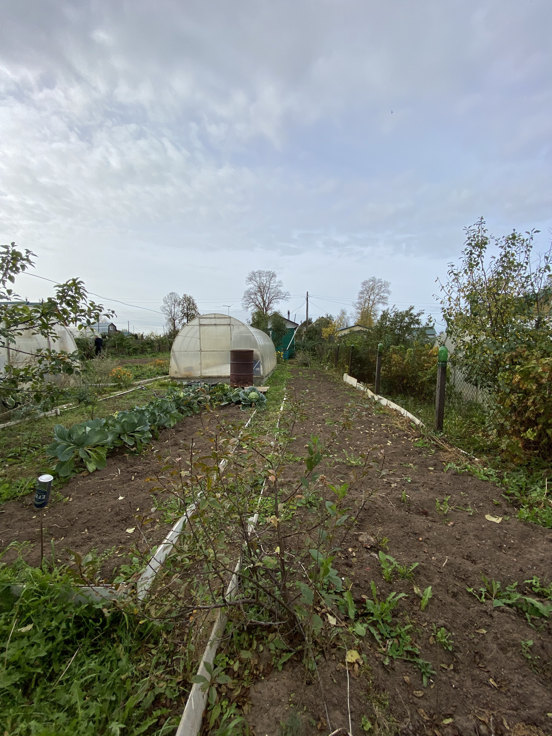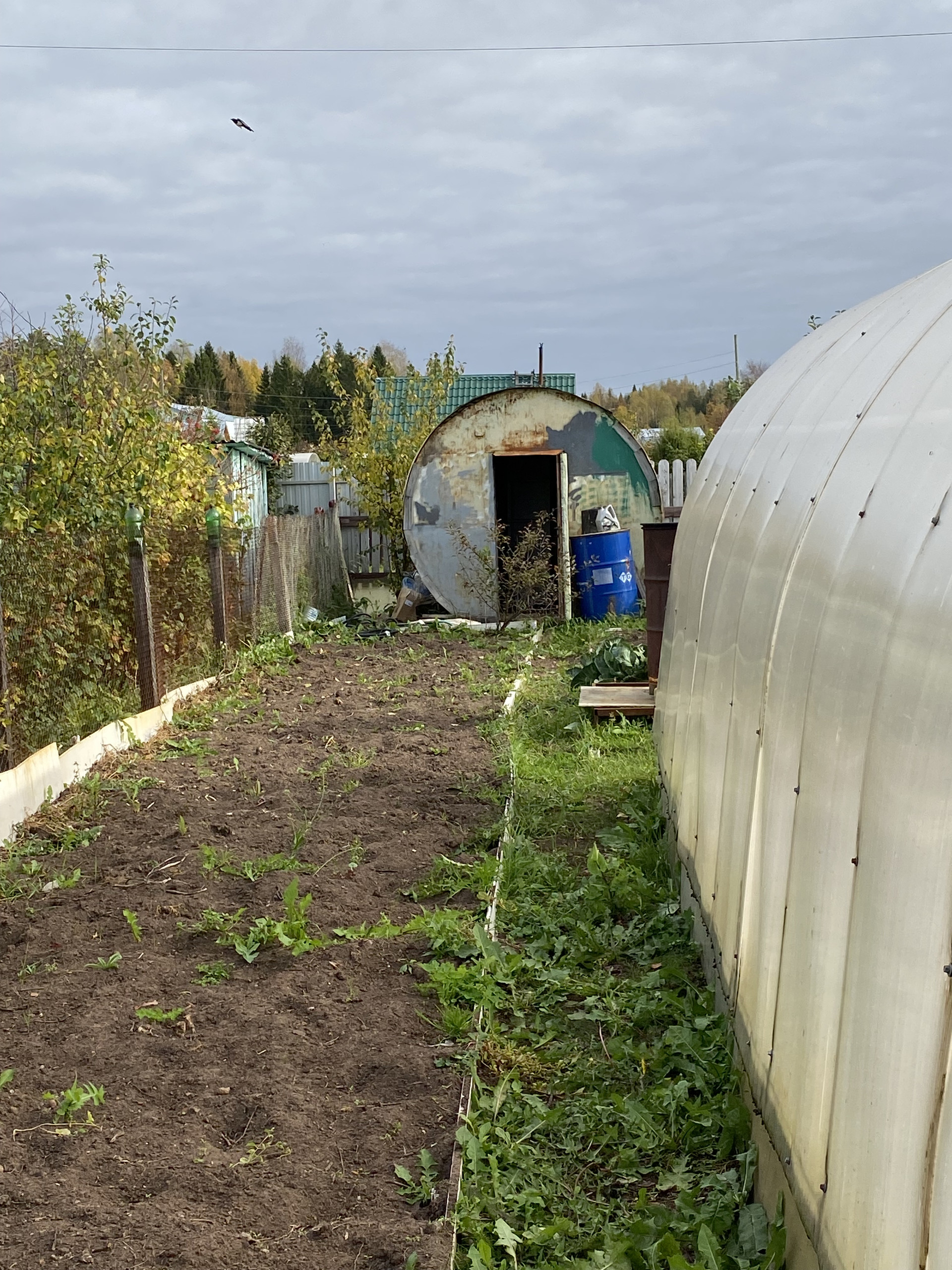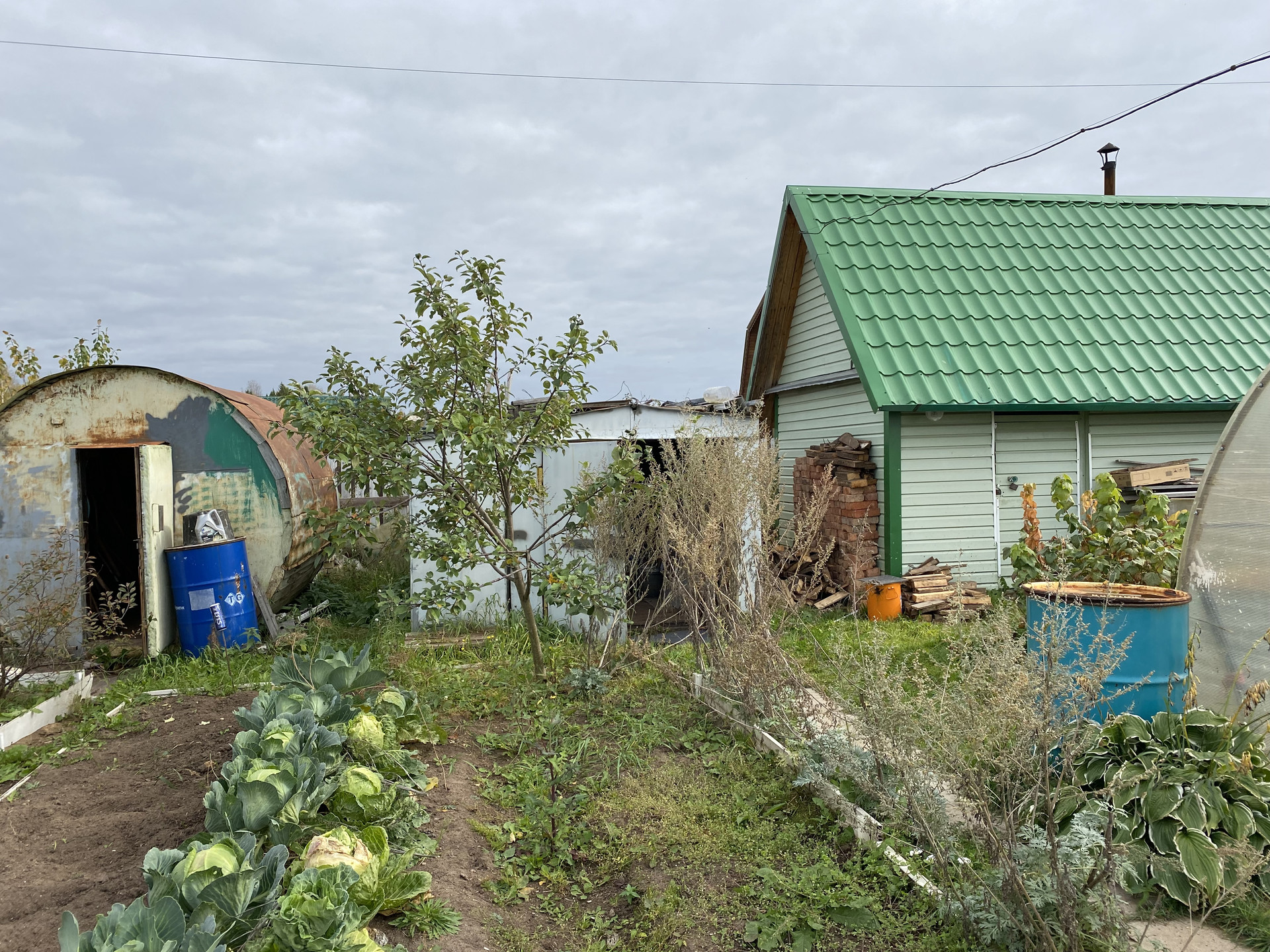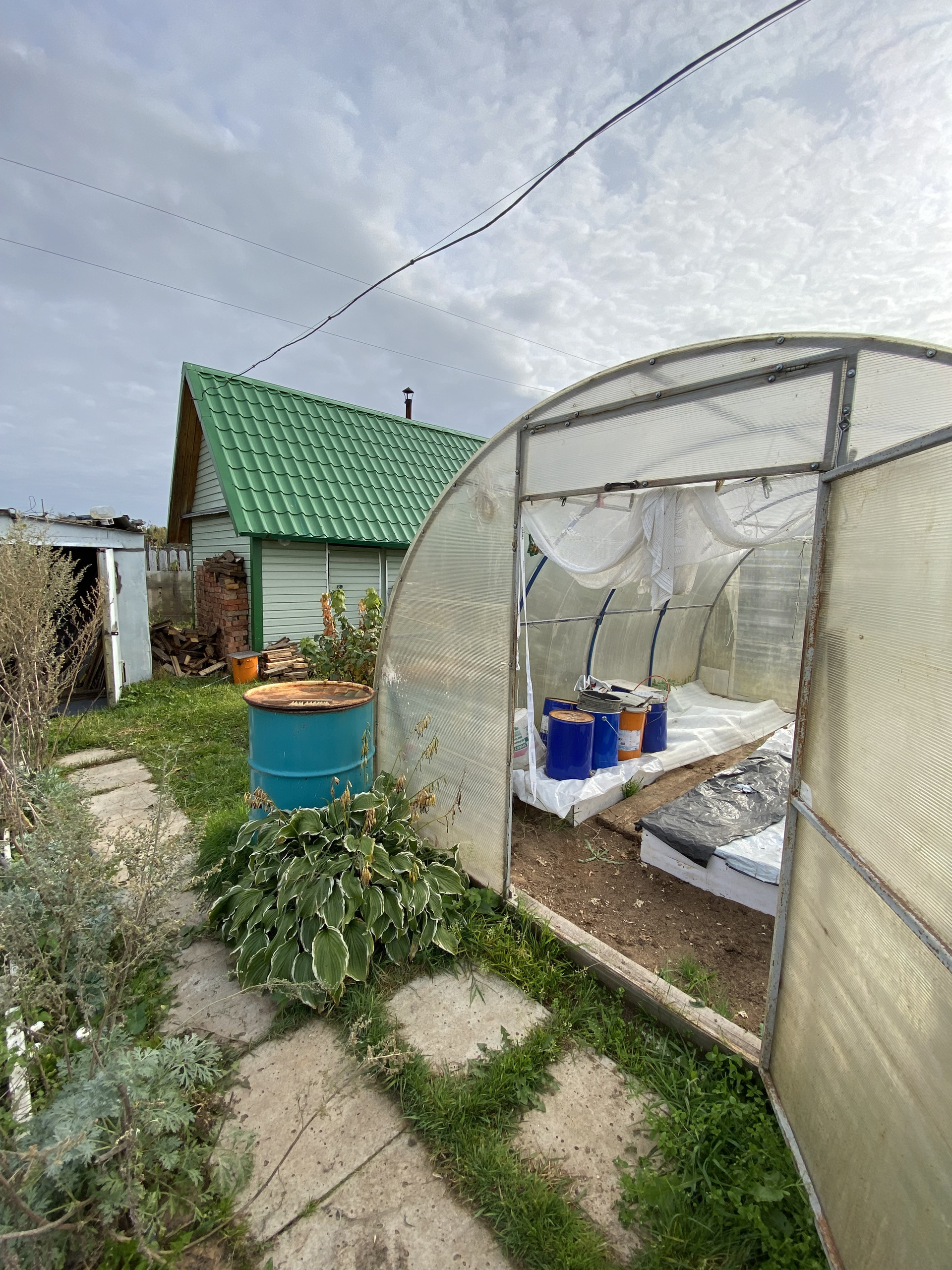 Много кустов малина, смородина, крыжовник ,  5 яблонь, груши. Земля удобрена. Остается запас навоза, опила и дров. Много инвентаря и бочек под воду.