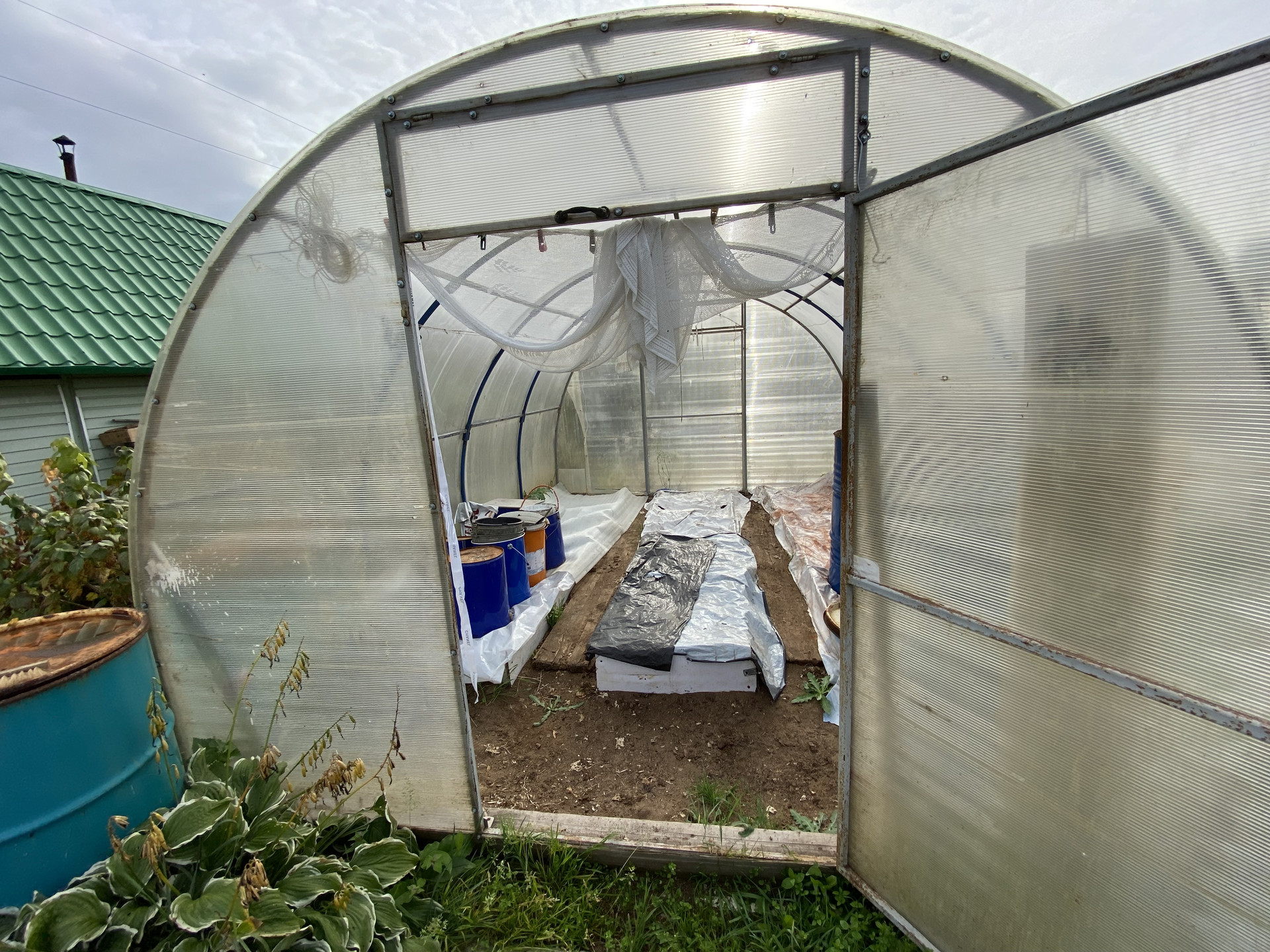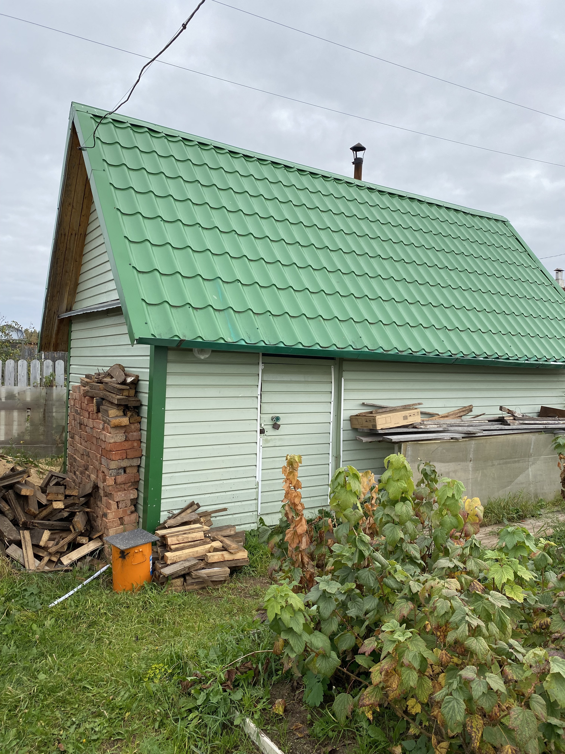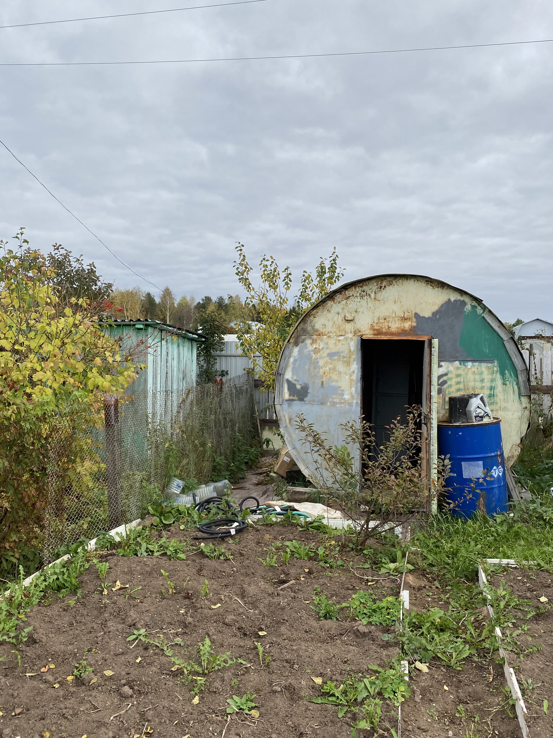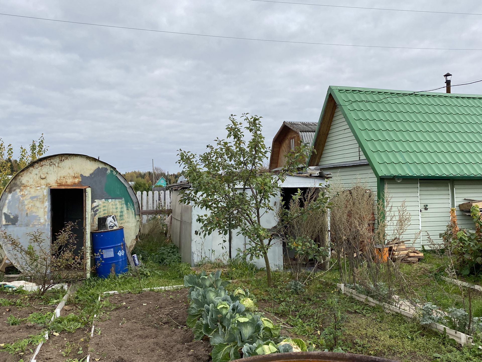 Много кустов малина, смородина, крыжовник ,  5 яблонь, груши. Земля удобрена. Остается запас навоза, опила и дров. Много инвентаря и бочек под воду.