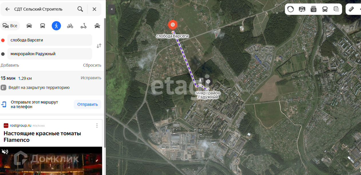 Отличная транспортная развязка (на запад и на восток). Дорога до участка ровная асфальтированная. Подъезд из щебня. Общественный транспорт - автобус №44. Минимальная удалённость от мкр.Радужный - 1,5 км.