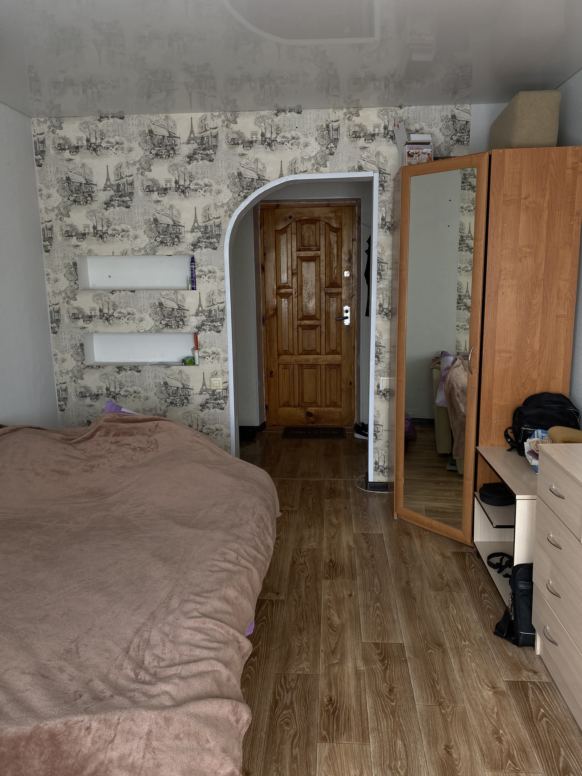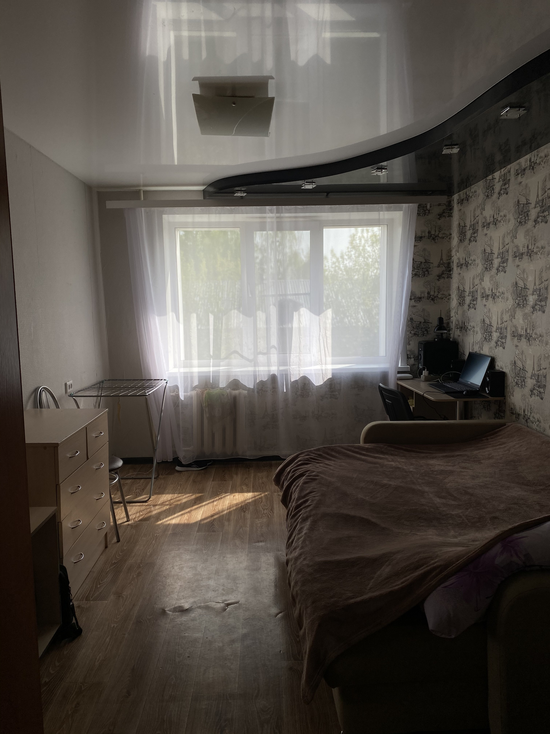 Комната находится на 4 этаже, дверь на двух ключах. В комнате хороший ремонт, натяжной потолок, пластиковое окно, линолеум. Есть все необходимое для проживания: диван, шкаф с большим зеркалом, тумба, письменный стол, стул, кухонный гарнитур. Из техники есть холодильник, стиральная машина.