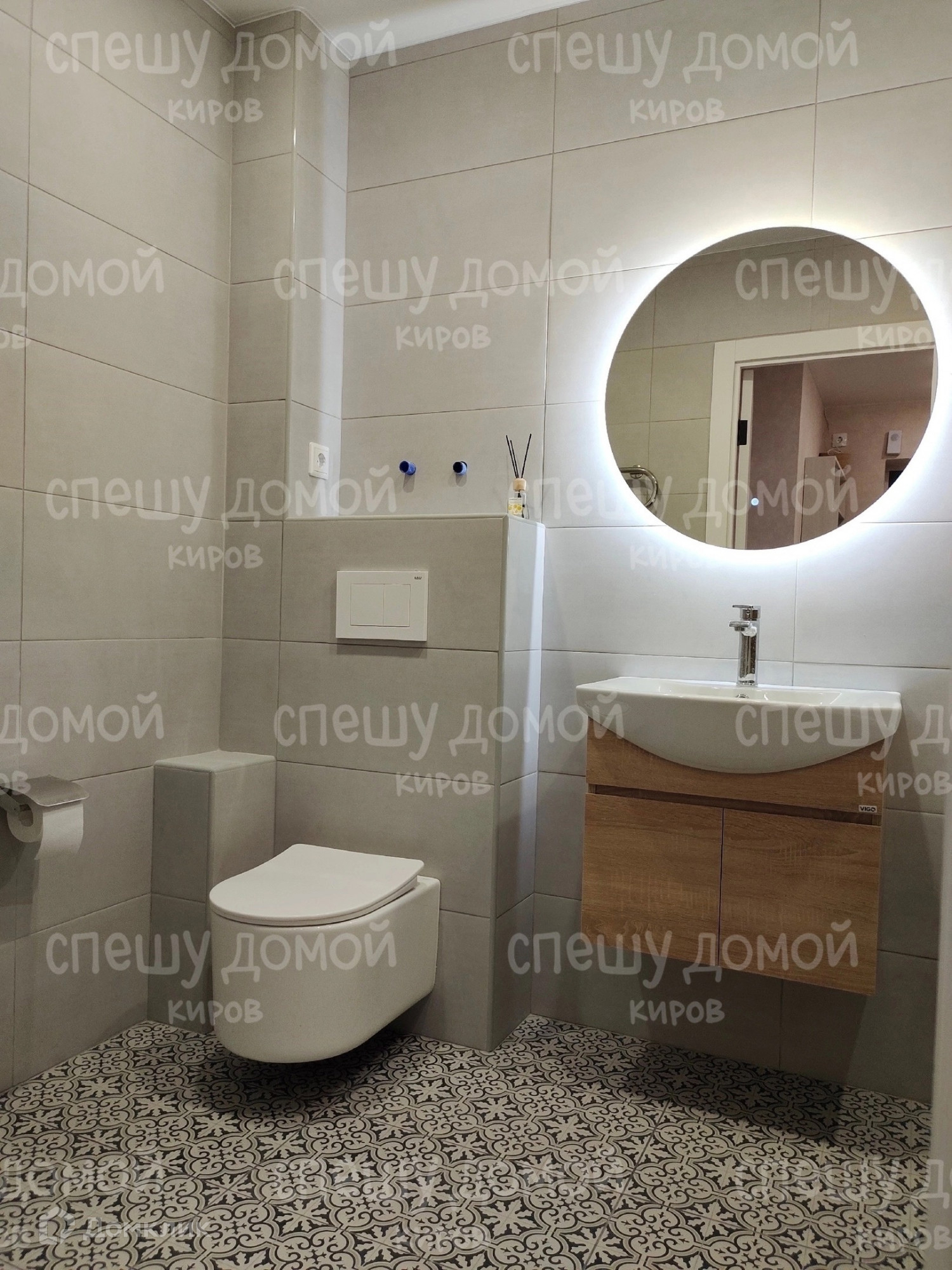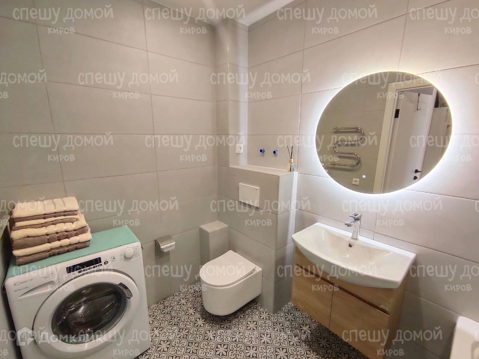 Санузел сделан из керамогранита: унитаз-инсталляция, акриловая ванна, стиральная машина.