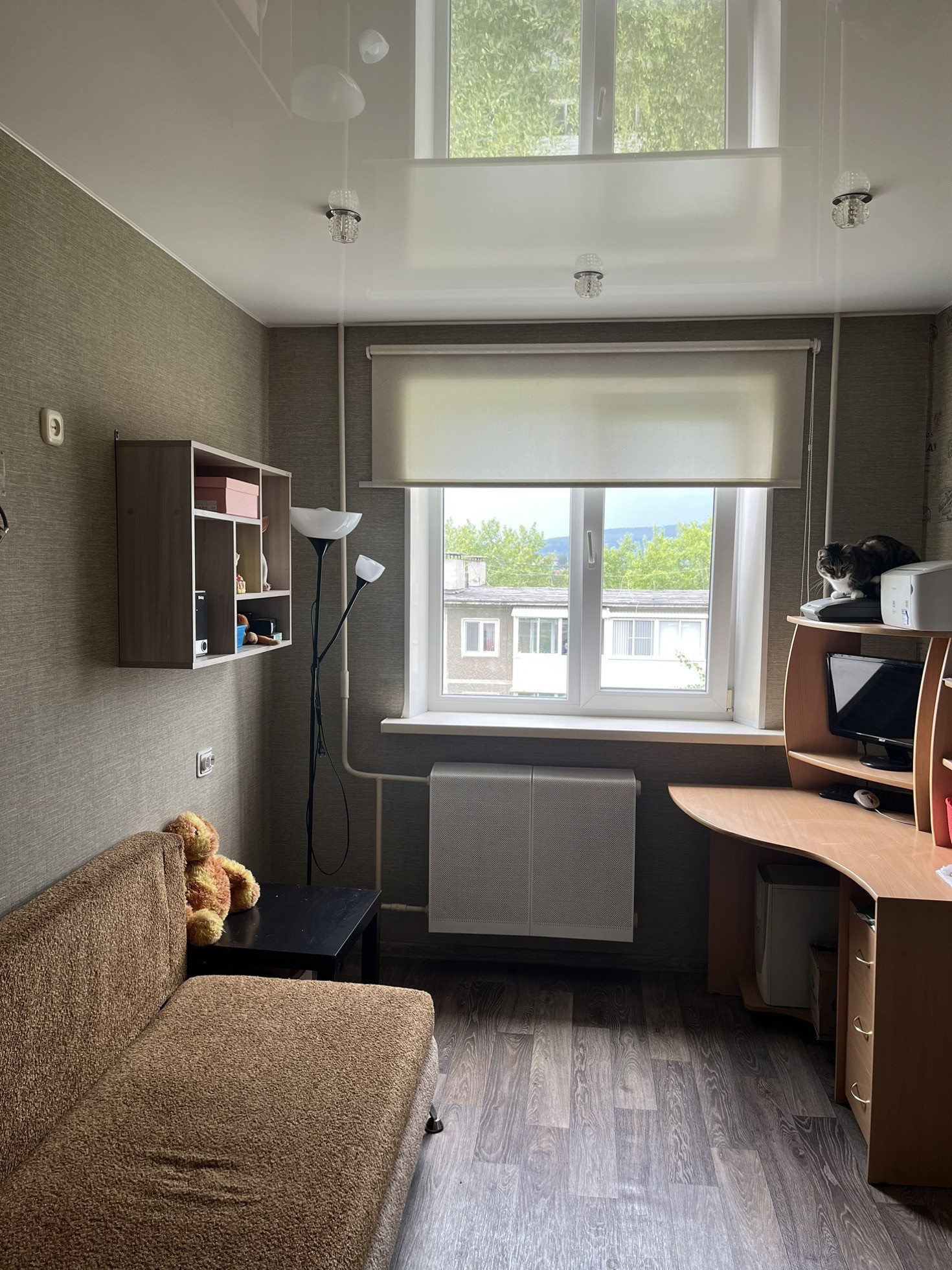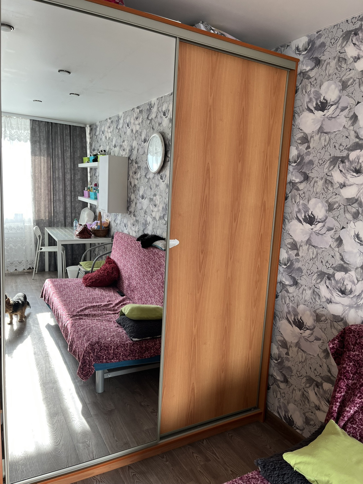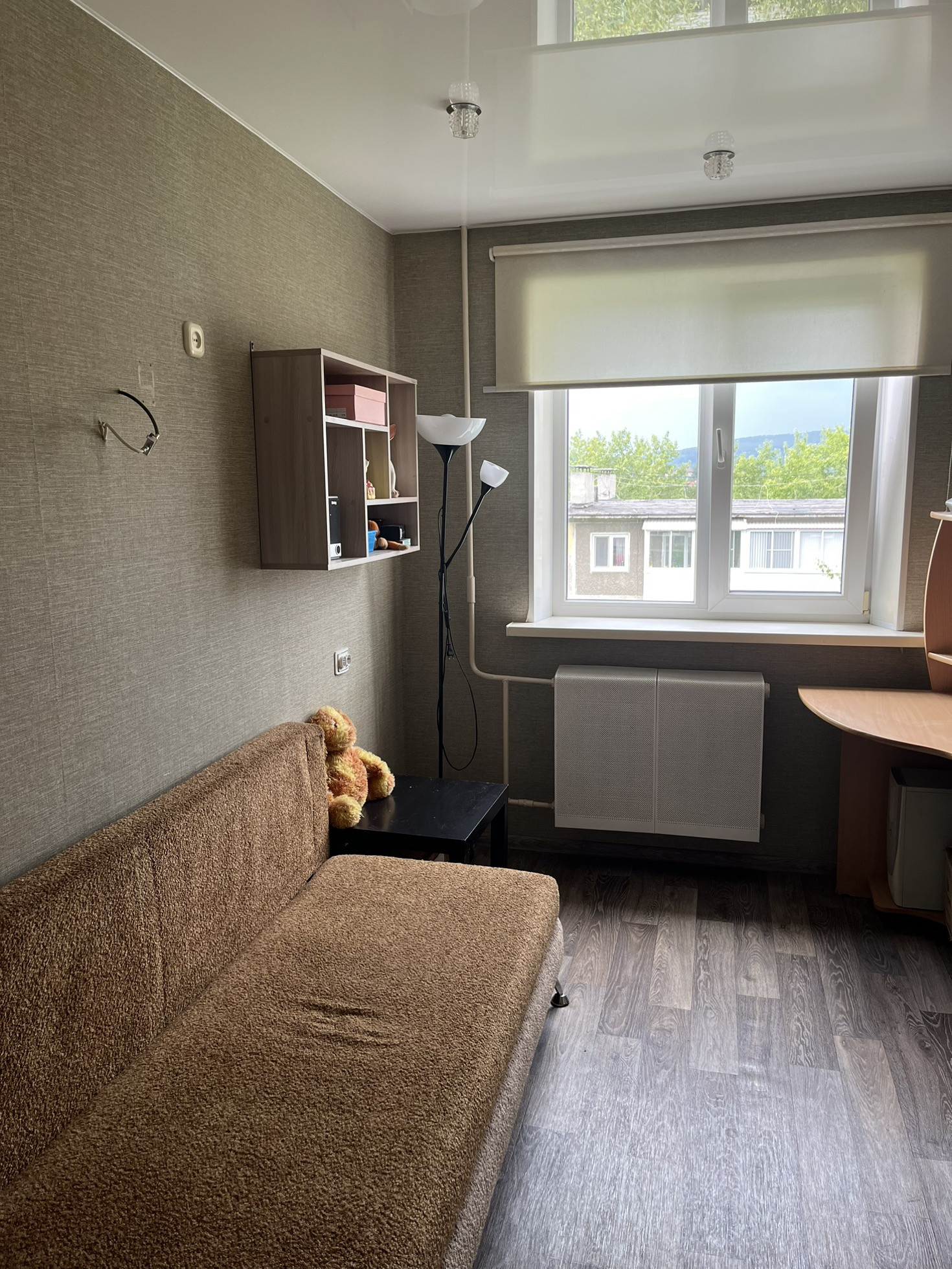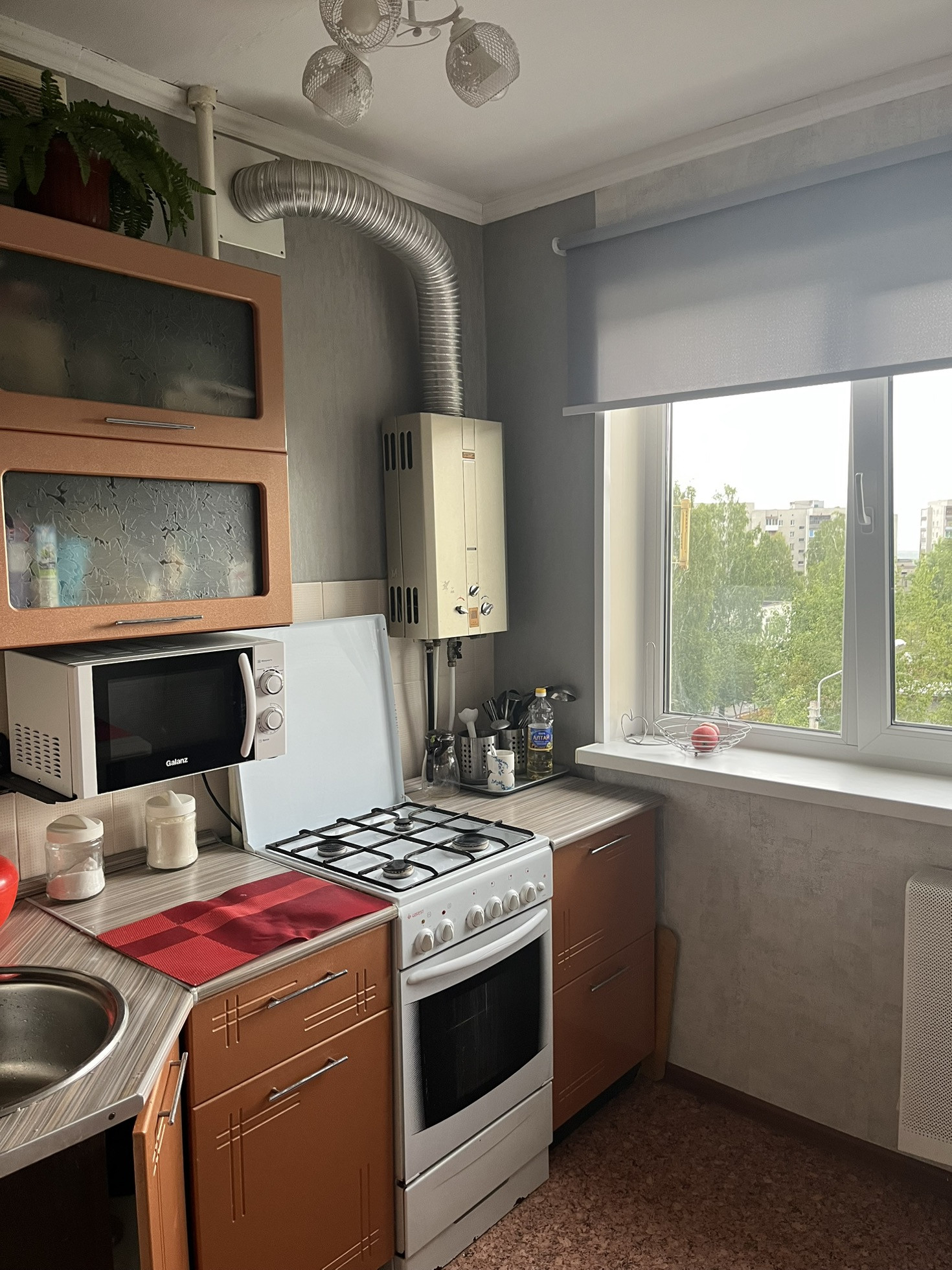 Продам трехкомнатную квартиру с газовой колонкой. Натяжные потолки в двух комнатах и коридоре. Комнаты все раздельные. В детской комнате встроенный шкаф. В одной комнате остается шкаф-купе с зеркалом. На кухне остается газовая плита и кухонный гарнитур. До обеда солнечная сторона со стороны кухни и гостиной, после обеда со стороны детской и спальни. В квартире везде пластиковые окна, деревянный застекленный балкон, входная сейф дверь, межкомнатные двери. Ванна с туалетом в кафеле. При осмотре небольшой торг.
