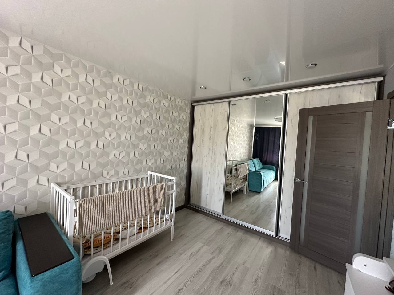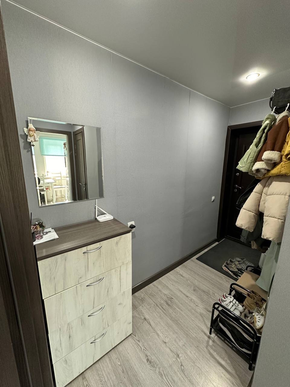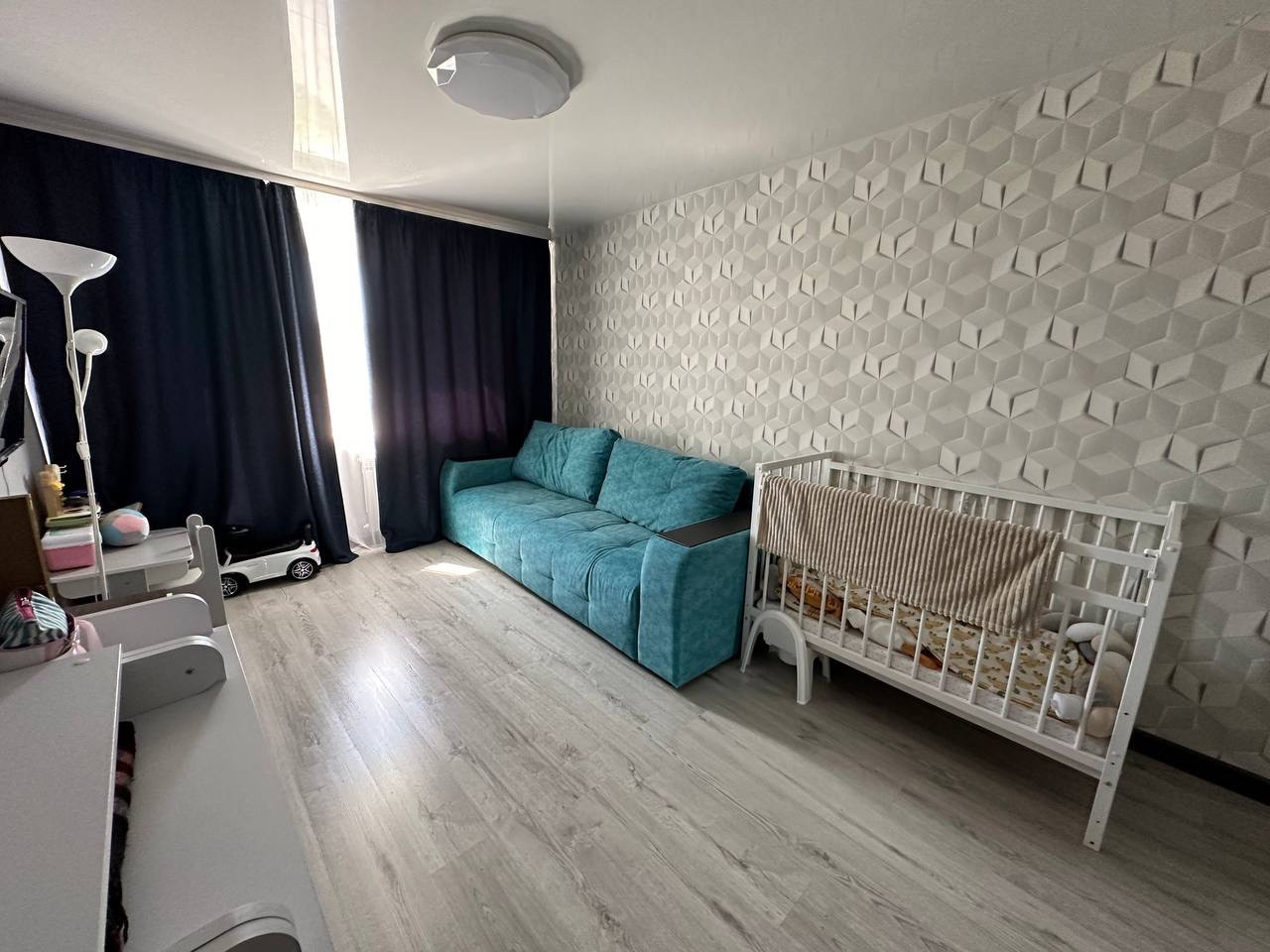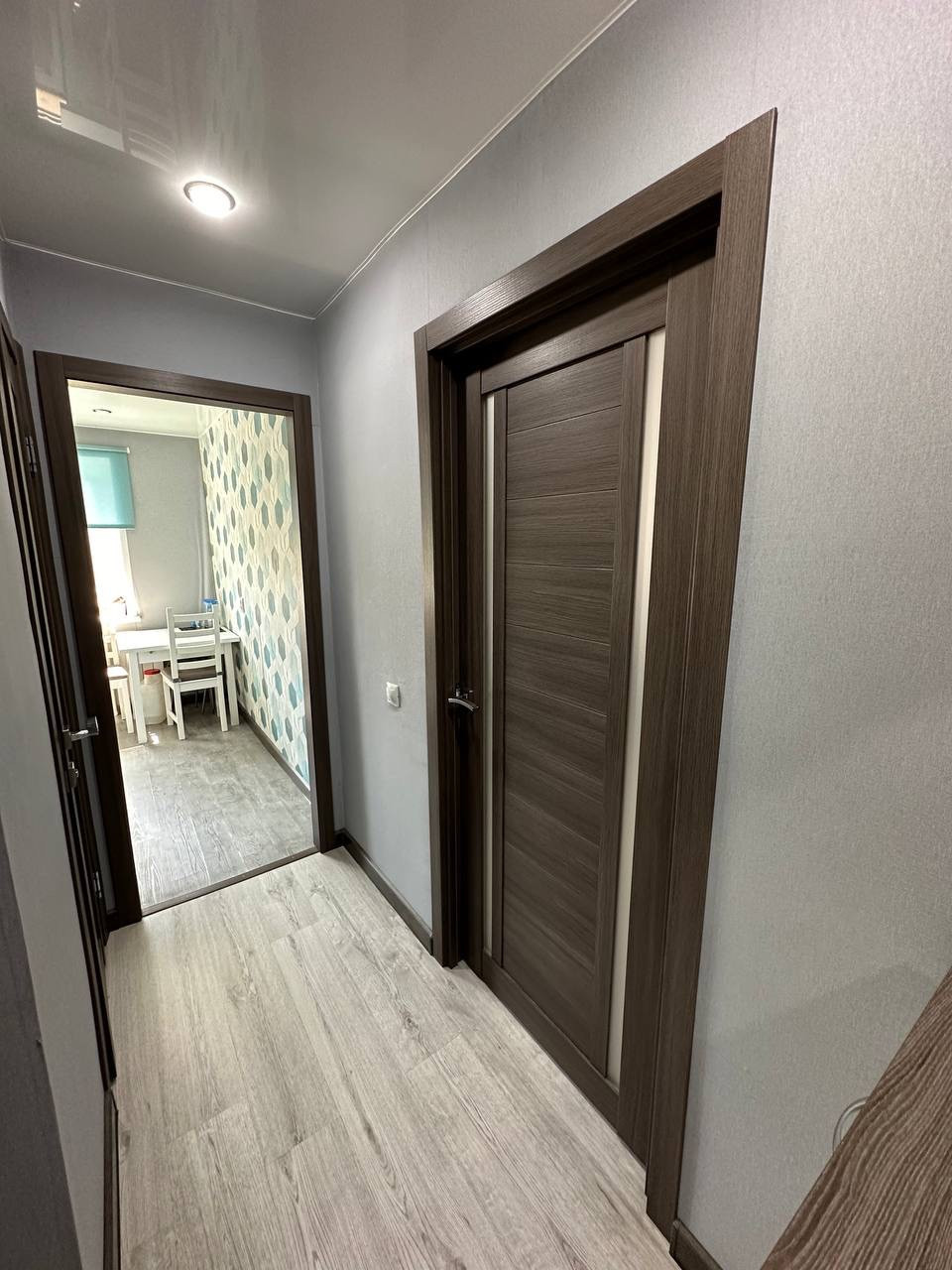 Все полы выровнены. Комната и коридор-ламинат, кухня-пвх плитка. В санузле на полу плитка, стены-панели, на потолке-панели.