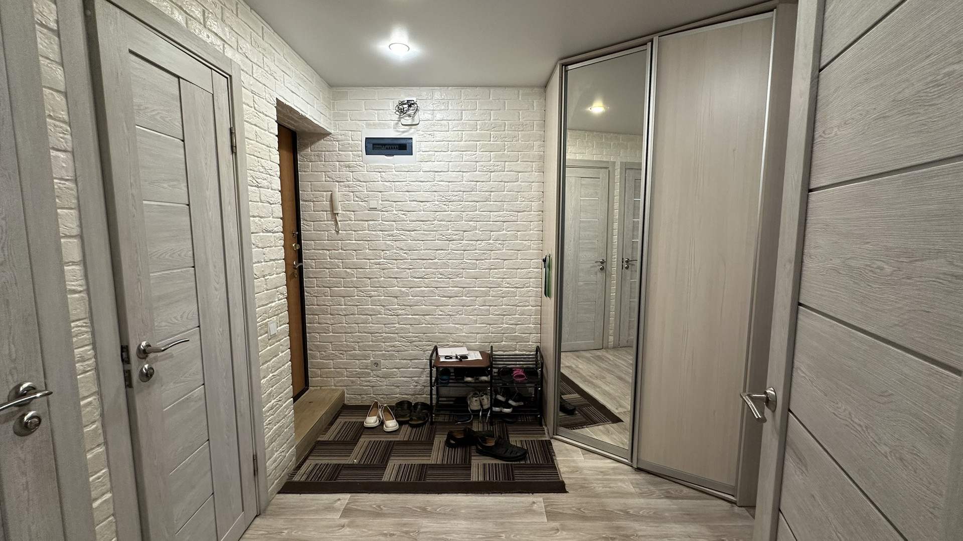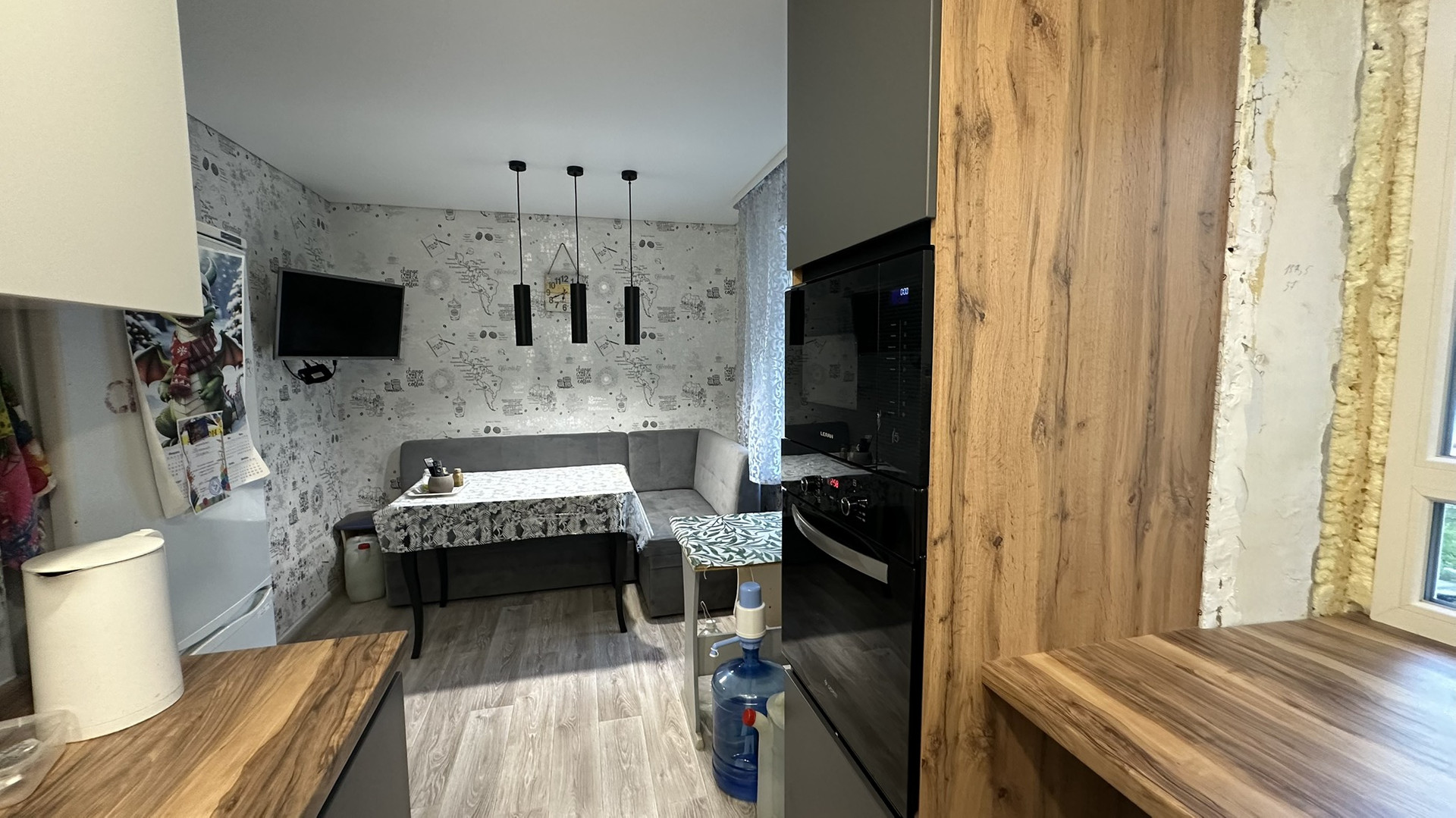 В квартире газовая колонка, новый кухонный гарнитур, пластиковые окна, полы и стены выровнены, замена электропроводки, на полу линолеум, в ванной кафель, в туалете на стенах ламинат, межкомнатные двери, встроенный шкаф.