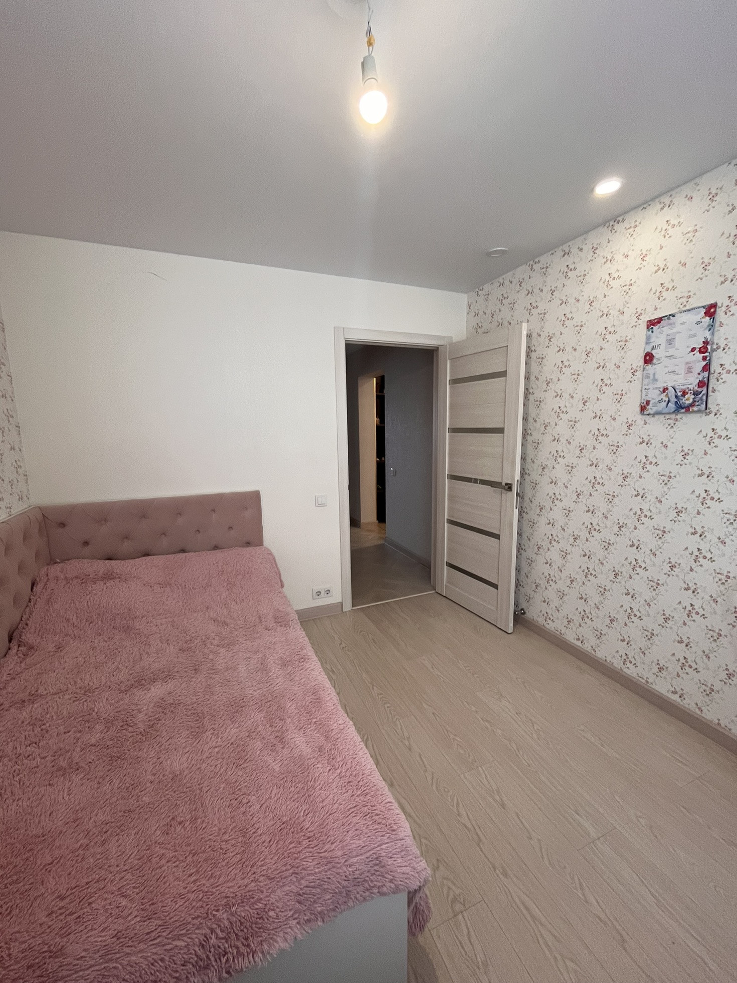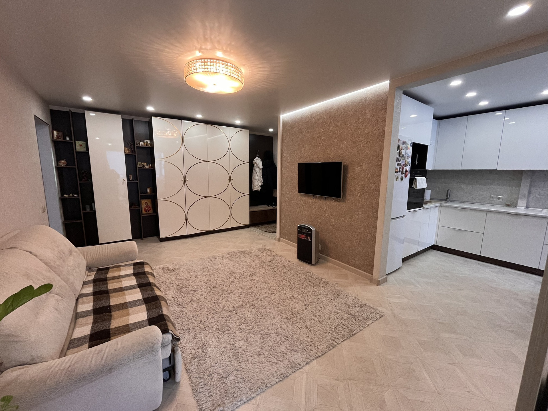 Остается встроенная кухня и техника , встроенный шкаф -купе, спальня (кровать и тумба).