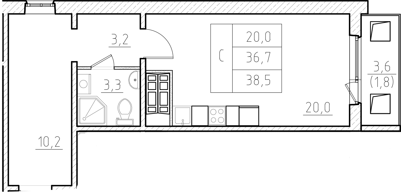 Общая площадь 36.6 м2
