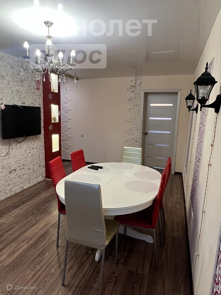 - В гостиной имеется большой стол, шесть стульев и барная стойка.