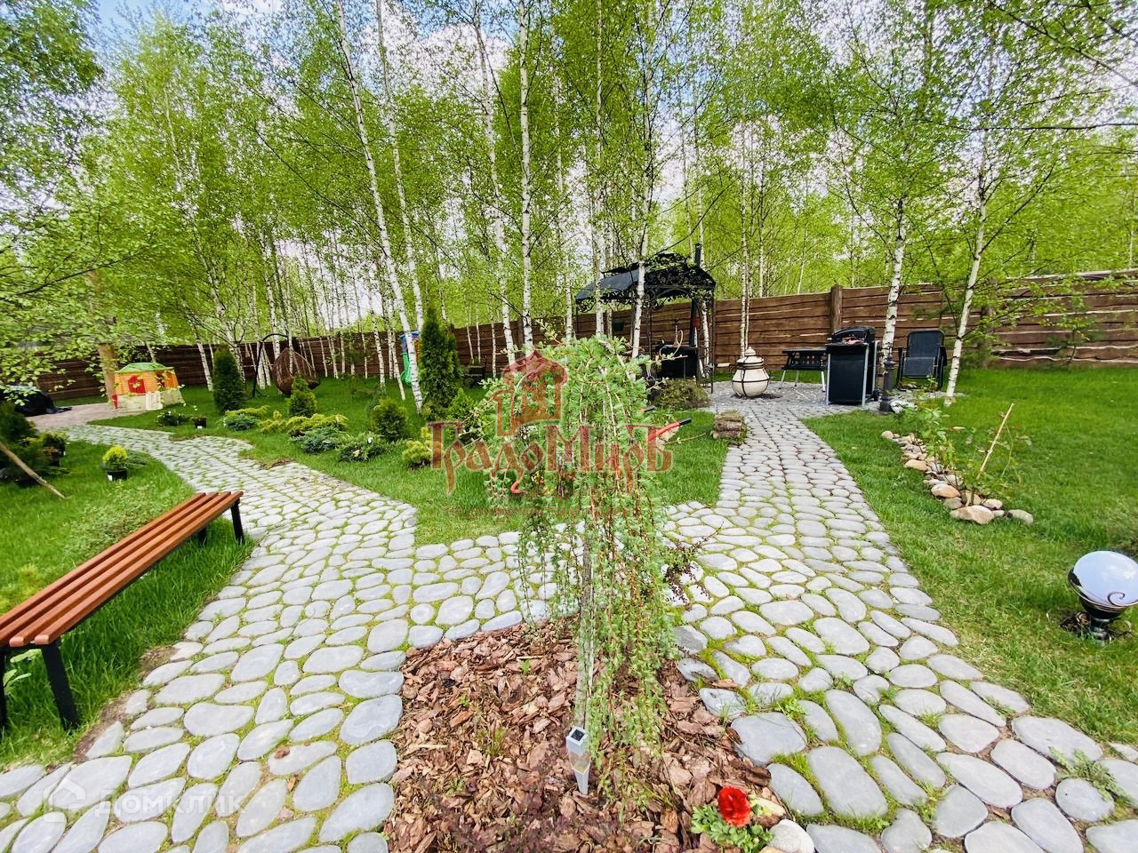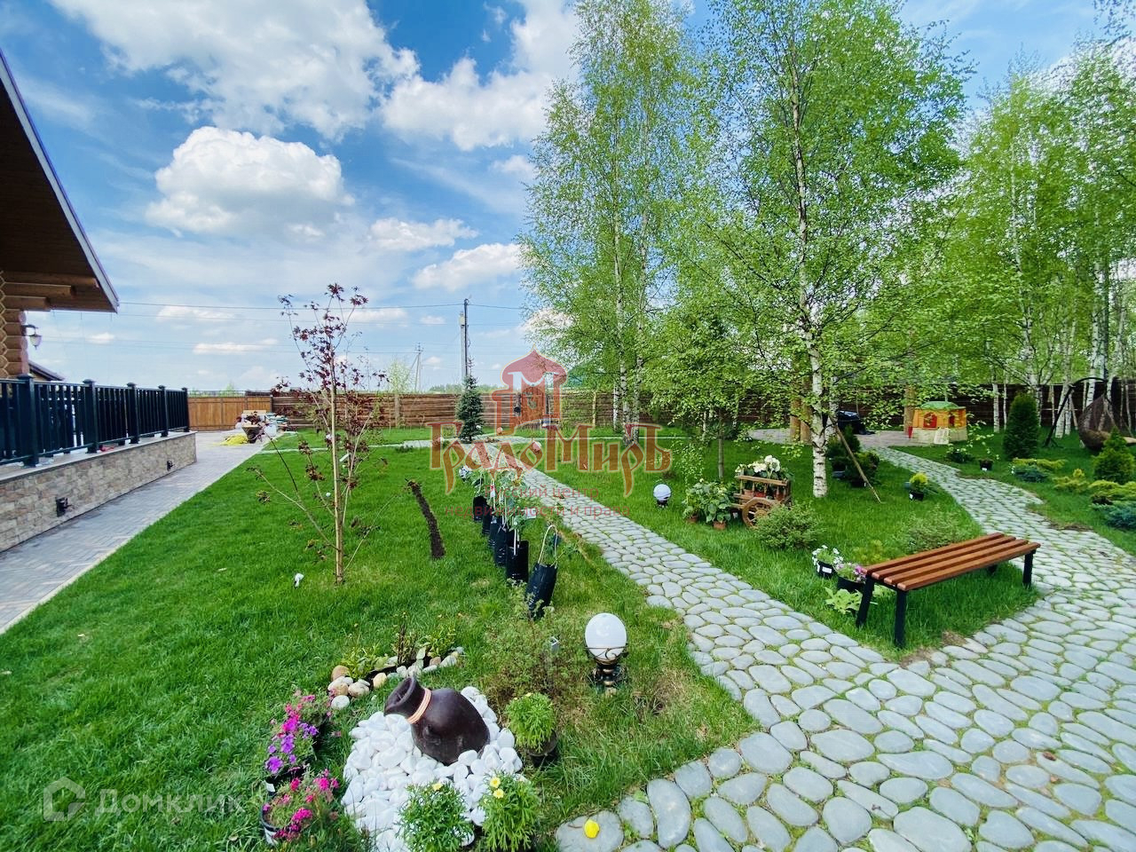 На участке сделана отмостка вокруг дома, дорожки, дренажная система по периметру дома, зона кострища, подпорная стенка высотой 40 см с подсветкой, небольшой прудик с фонтаном.