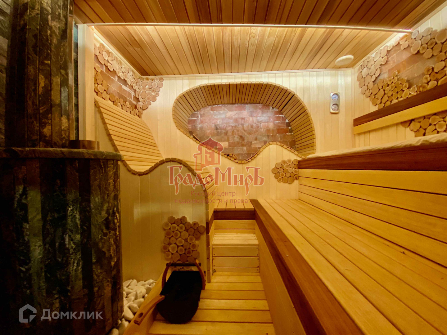 В бане установлена печь Ферингер в облицовке из жадеита, оргономичный лежак в гималайской соли, потолок выполнен из кедра, по обеим сторонам панно из можжевельника вокруг гималайской соли.