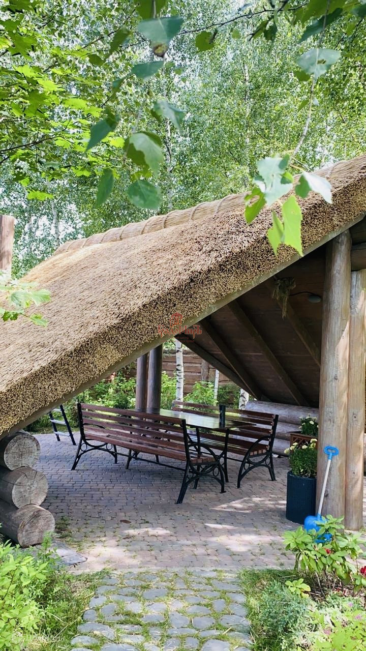 Беседка (сделан каркас) так же из бревна 320 диаметра, не хватает по проекту соломенной кровли;