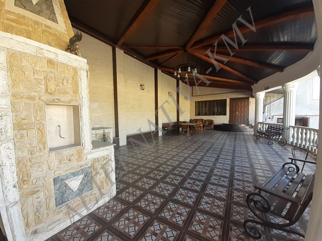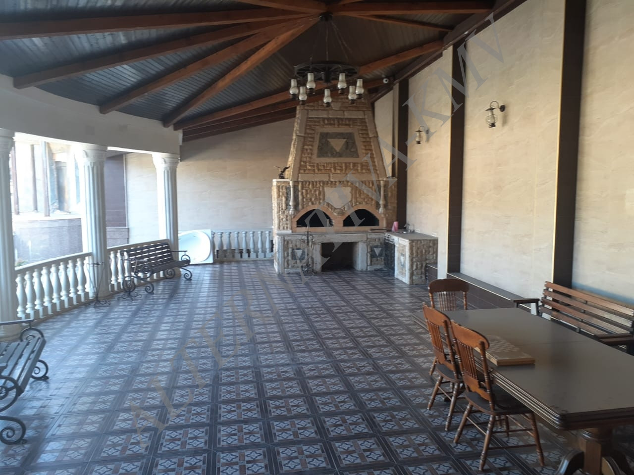 Открытая просторная оборудованная беседка  с камином  широким столом для семейных пиршеств.