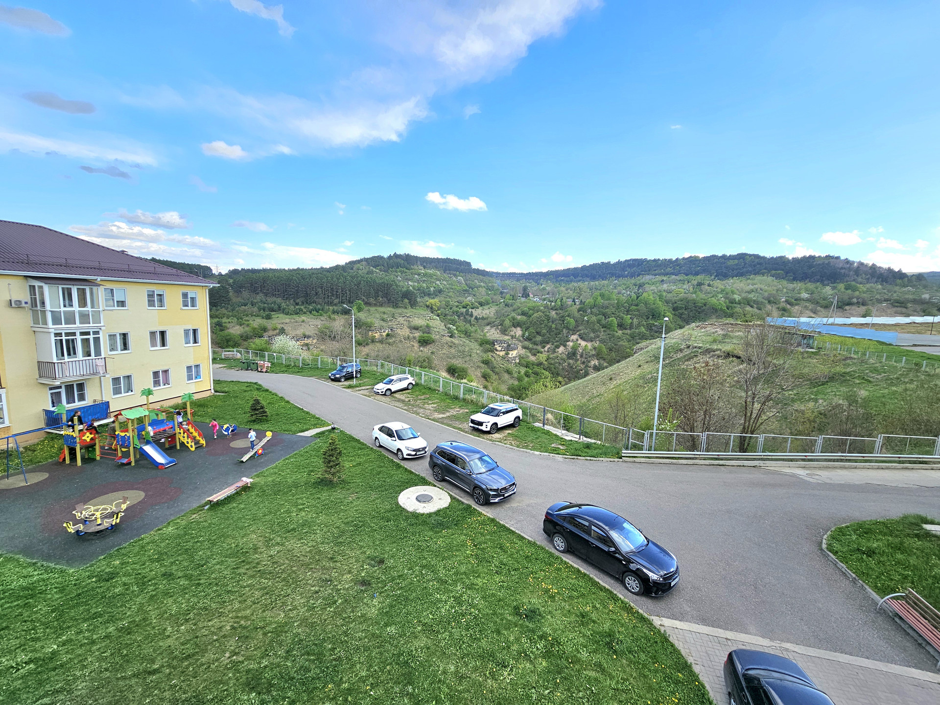 Большой и чистый двор, детская игровая площадка, зоны для отдыха на свежем воздухе, открытые парковки для автомобилей.