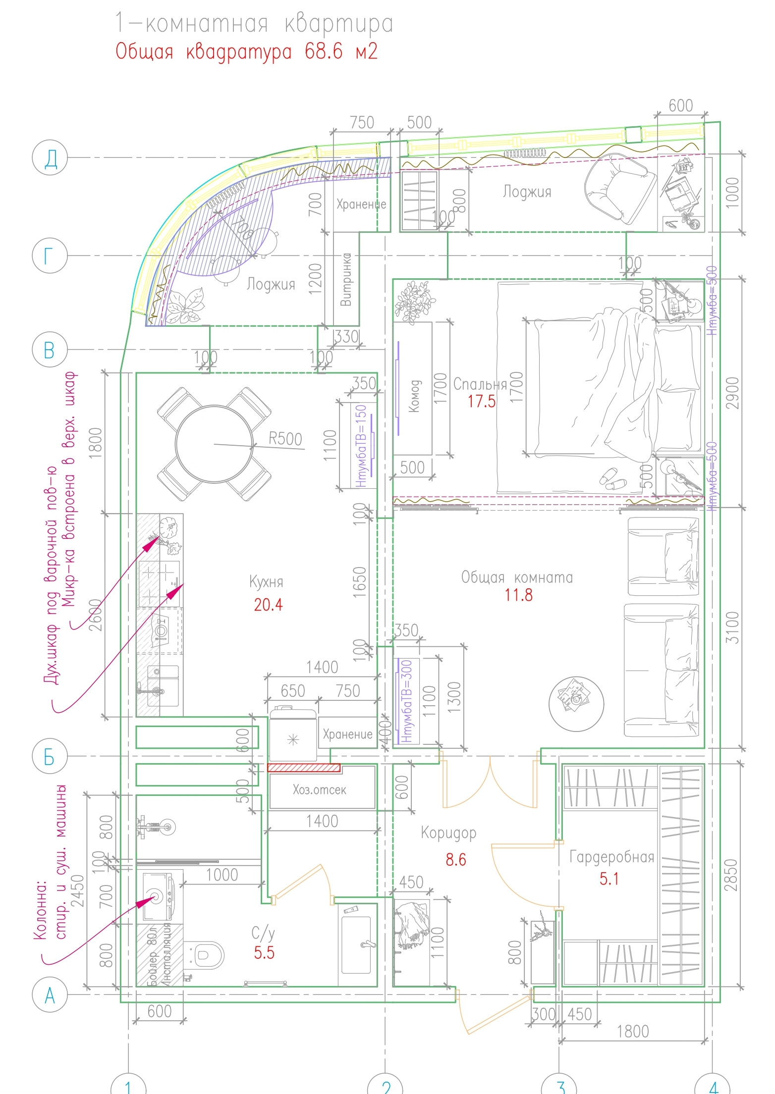 ⚠️ Общая площадь = 68,6 кв.м. (по внутренним обмерам), по документам = 66,4 кв.м.