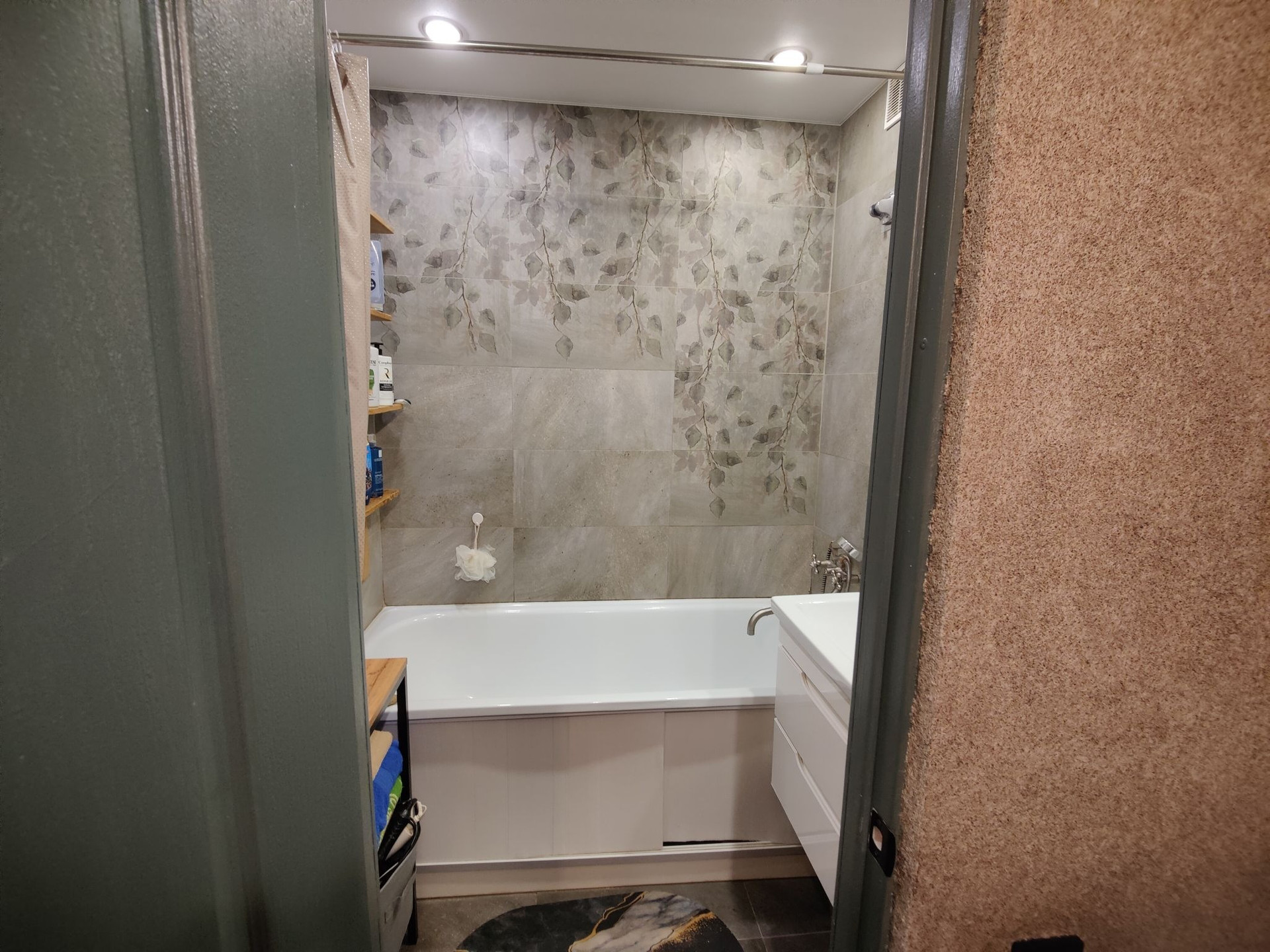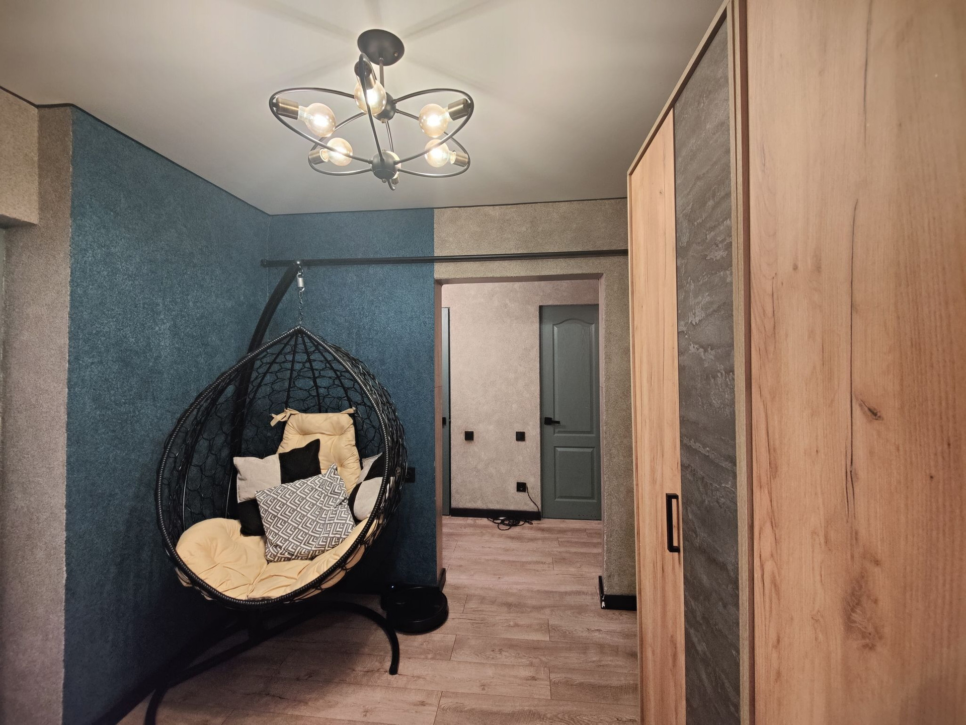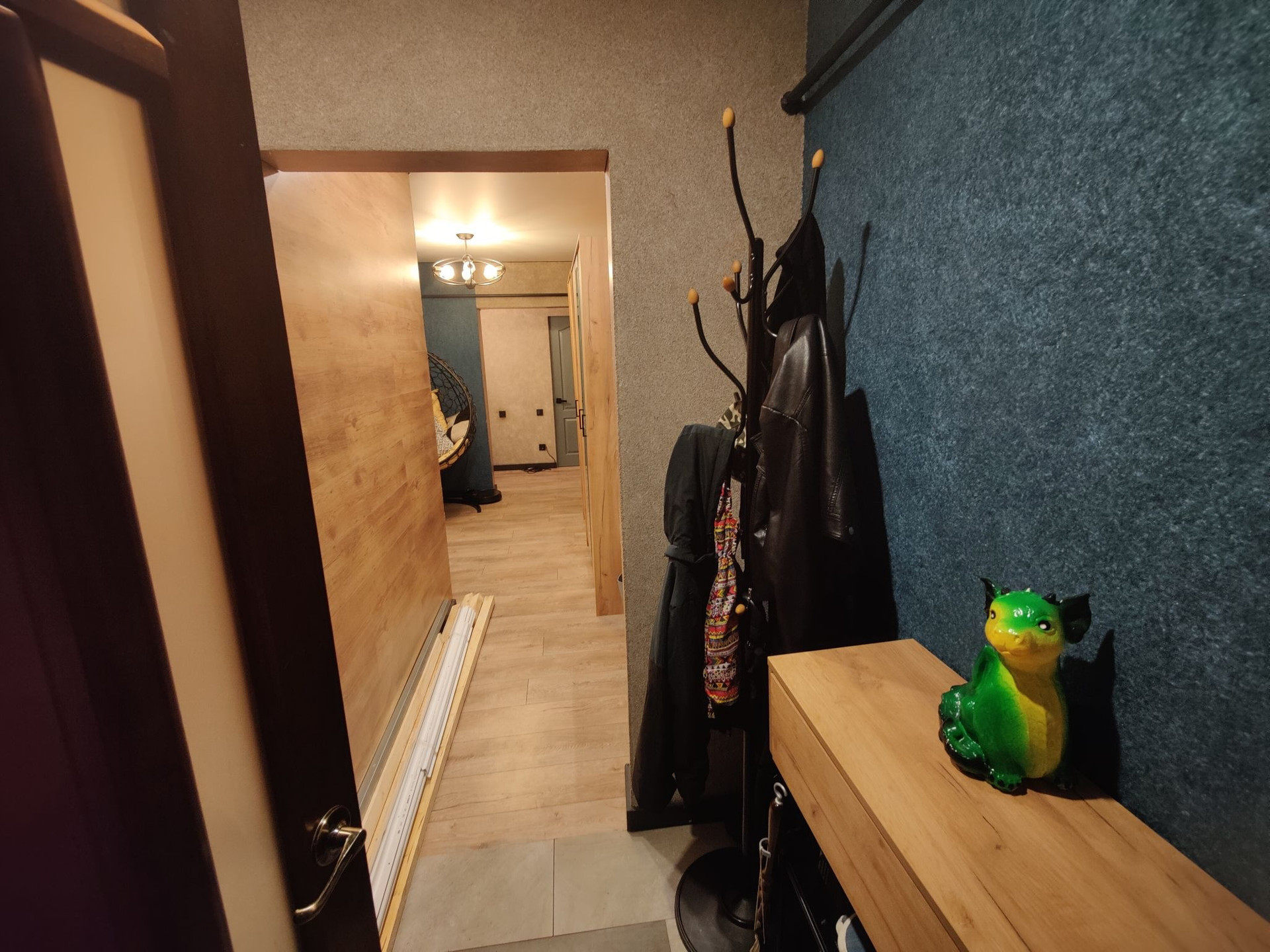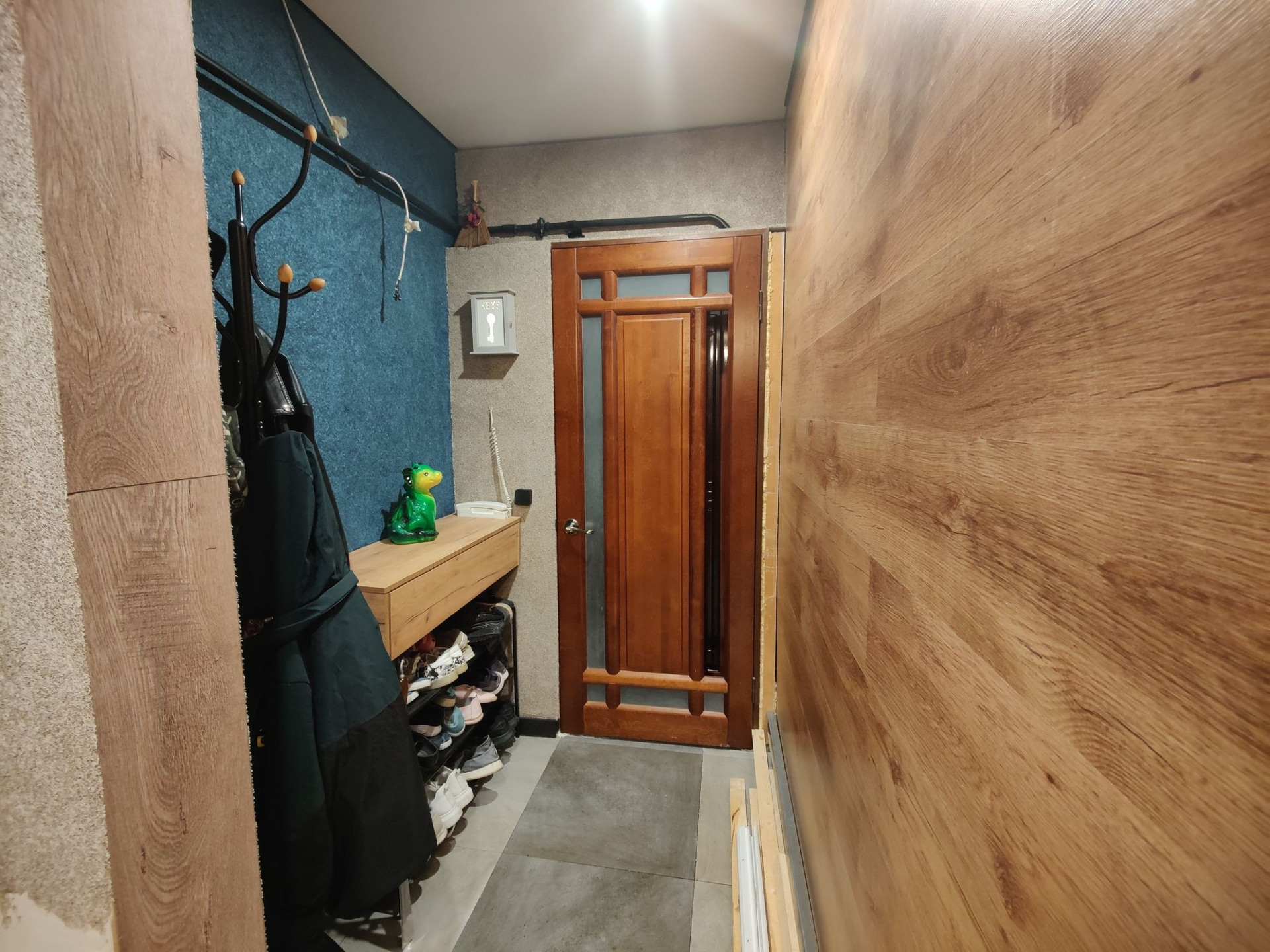 Коридор состоит из 3 частей: входная зона, зона квадрата с выходами (в детскую, кухню и зал) и 3 коридор с комнатами в разные стороны, а посередине туалет, ванная и кладовка). На стенах жидкие обои.