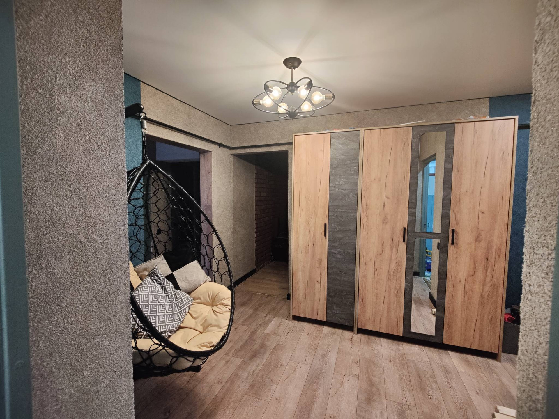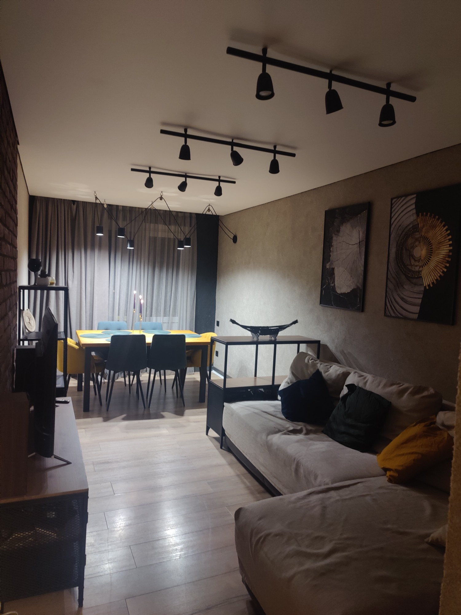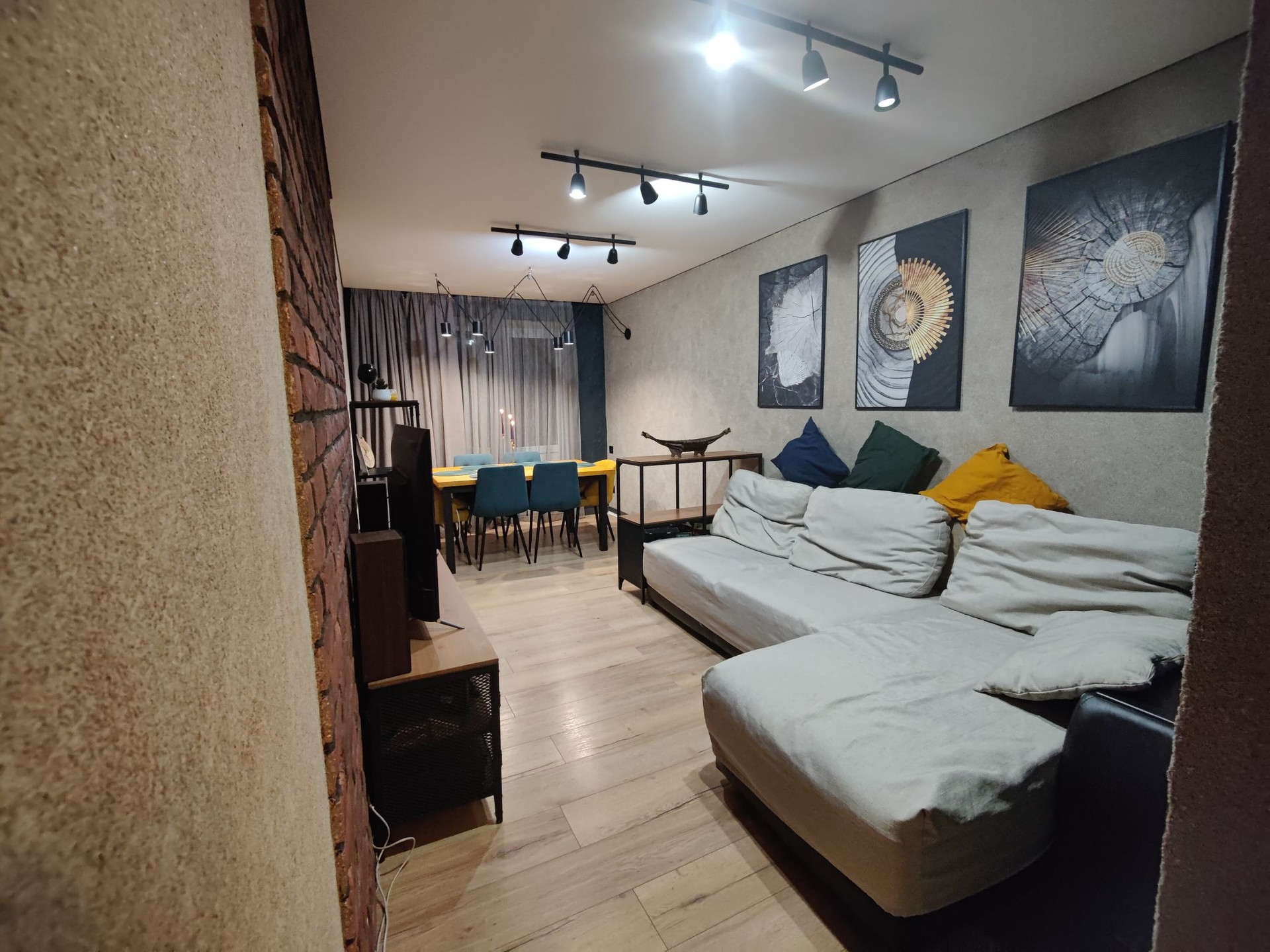 Зал и балкон(утеплили и продолжаем ремонт, материалы закуплены.)В зале 2 стены с декоративной штукатуркой, + кирпичная стена с подсветкой, на остальных стенках жидкие обои, красивый точечный свет над обеденной зоной и светильники над зоной отдыха.