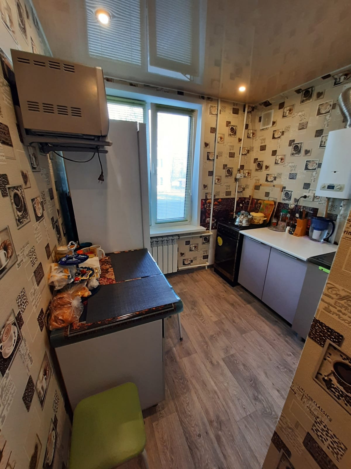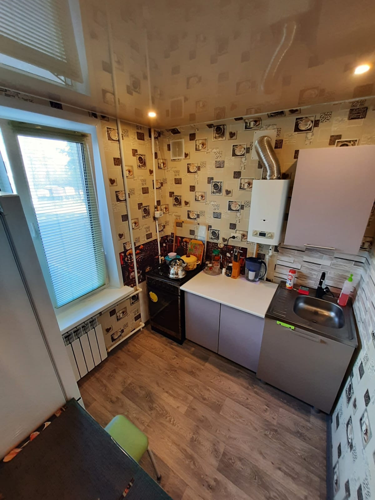 Квартире остаётся, частично мебель: кухня- жалюзи на окне, плита и колонка газовая, мойка со смесителем.