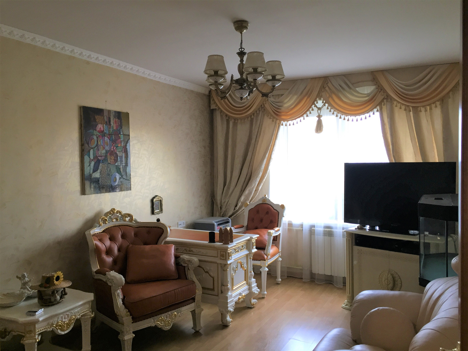 Квартира продается полностью с мебелью : кухонный гарнитур со встроенной бытовой техникой: стиральная машинка, посудомоечная машинка, кондиционеры, новый холодильник, два спальных гарнитура, кабинет обустроен очень дорогой эксклюзивной мебелью (производство Италия).