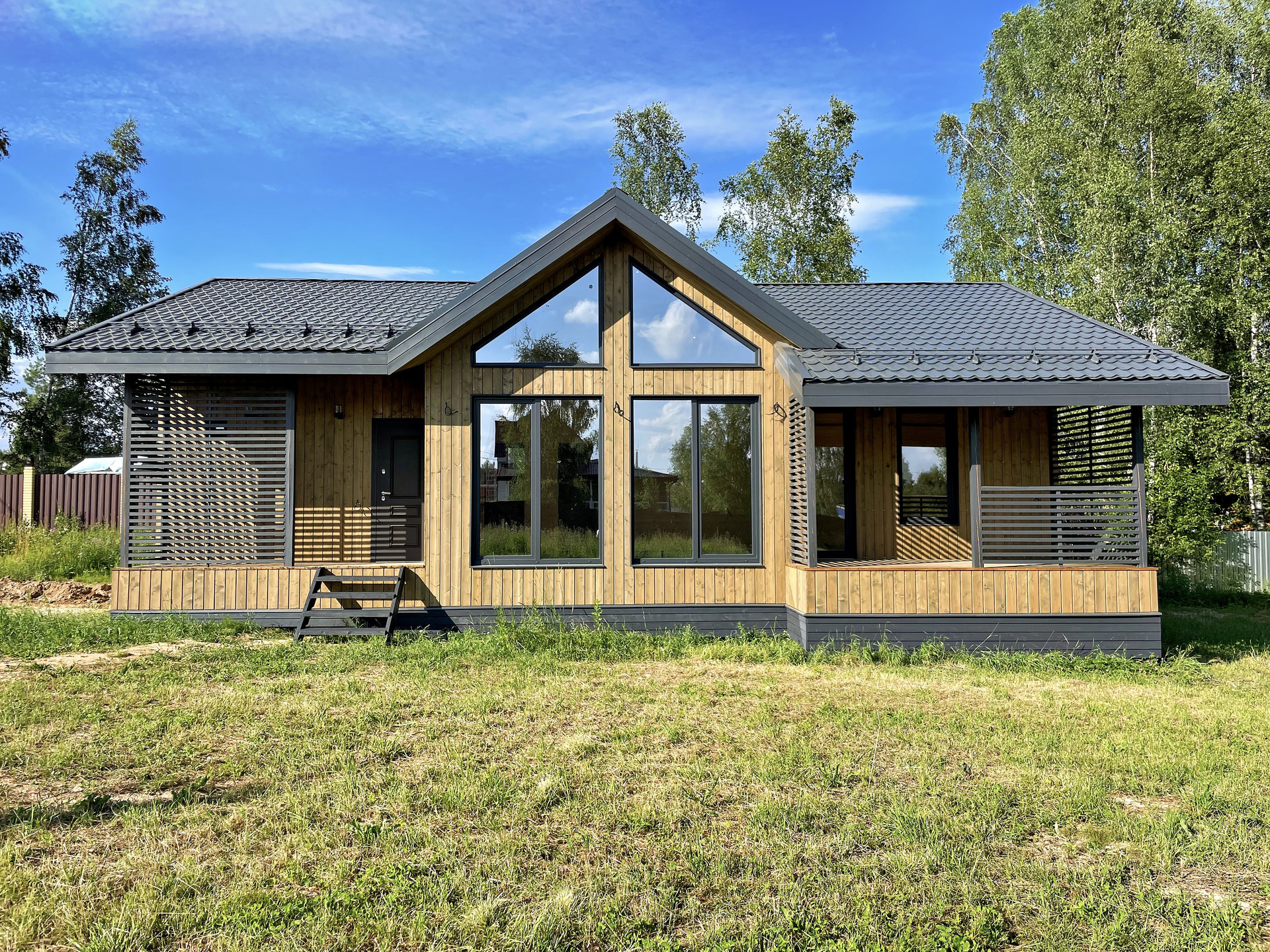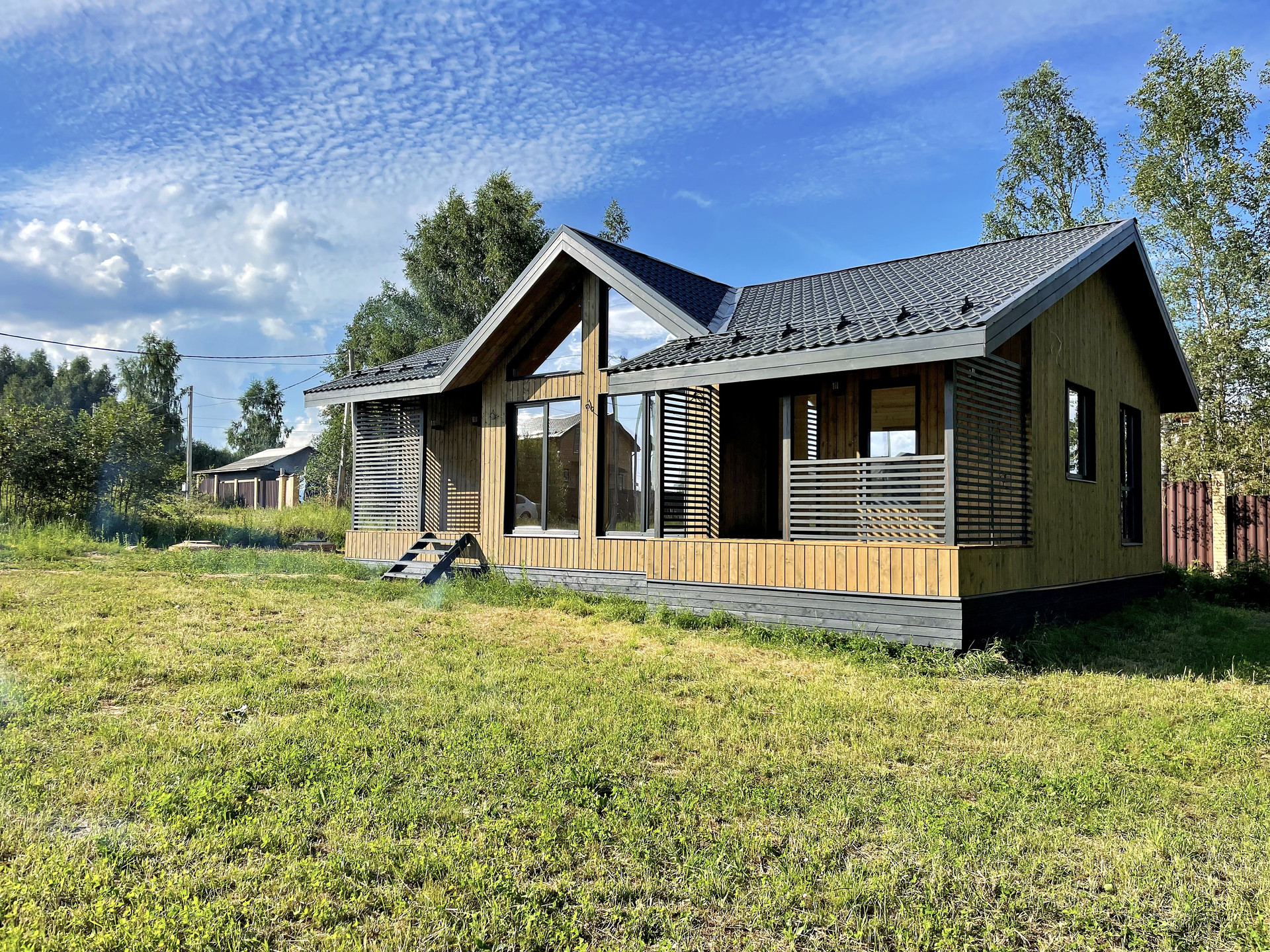 Каркасная технология, с соблюдением всех нормативов. Утепление 200мм (пол, крыша, стены). Крыша - металлочерепица (Grаndlinе), Окна ПВХ (профиль 70мм, 3 стекла с энергосбережением). Наружная и внутренняя обшивка - имитация бруса, окрашена краской Тikkurilа в 3 слоя.