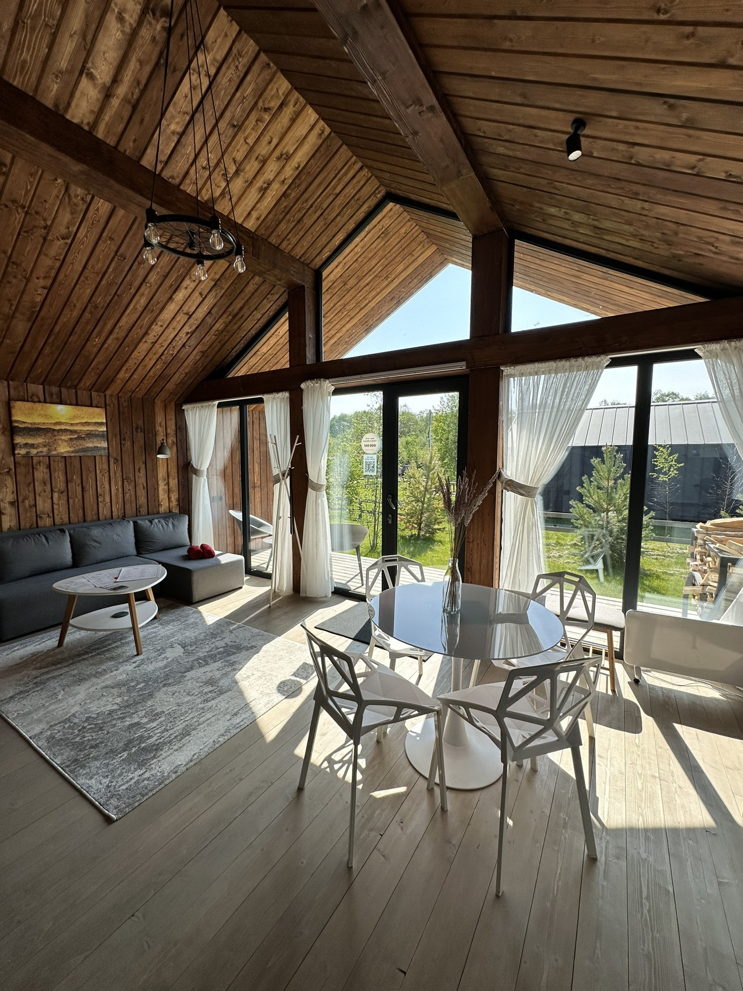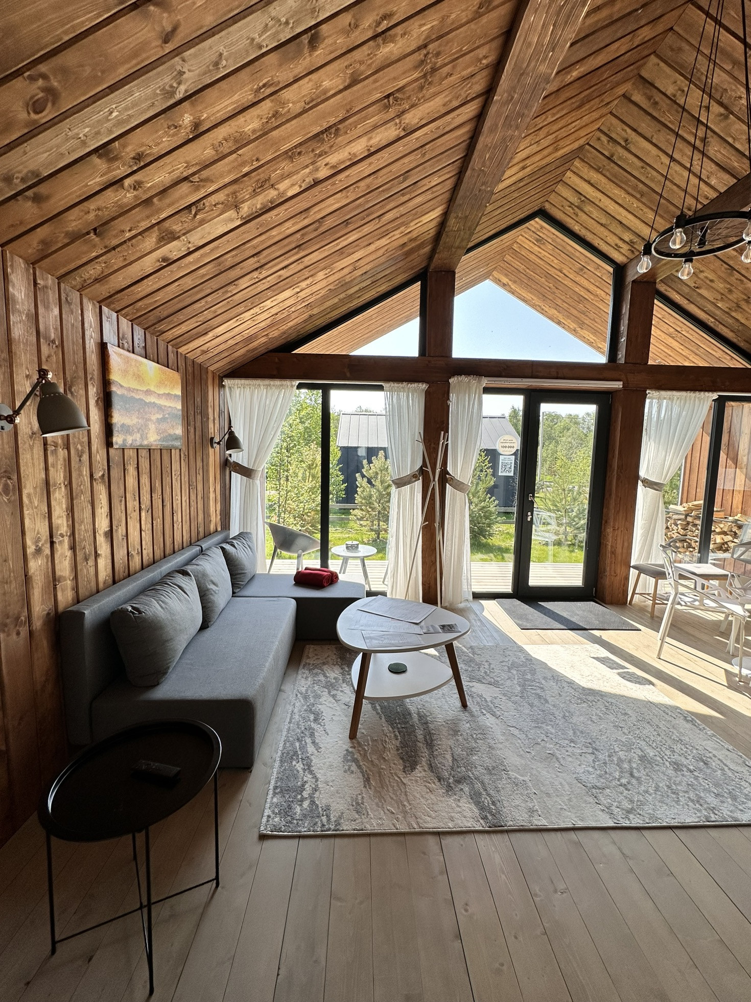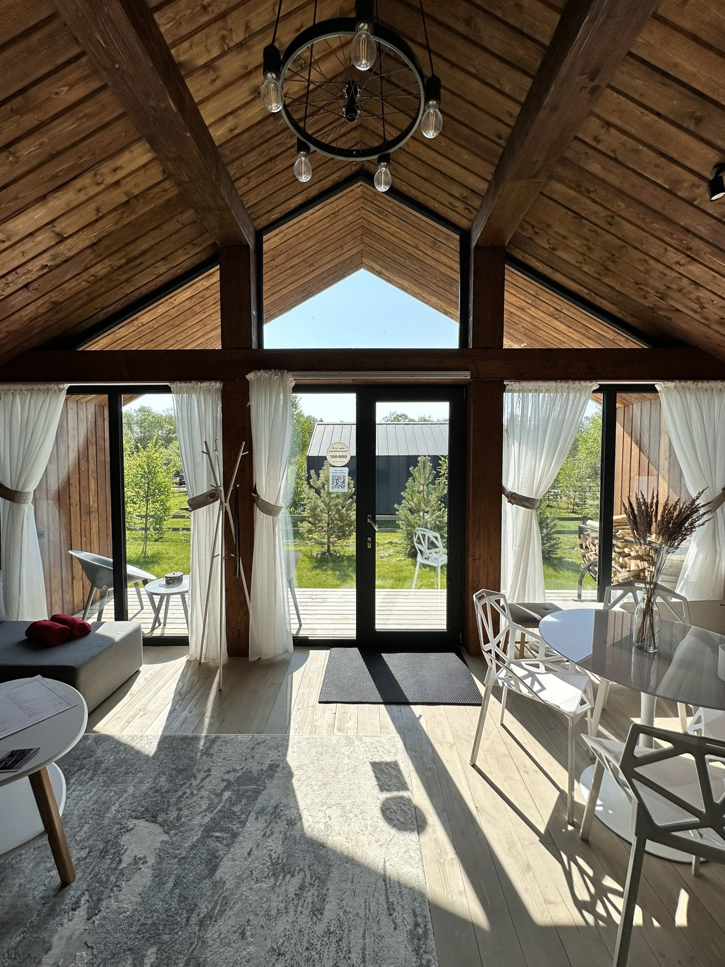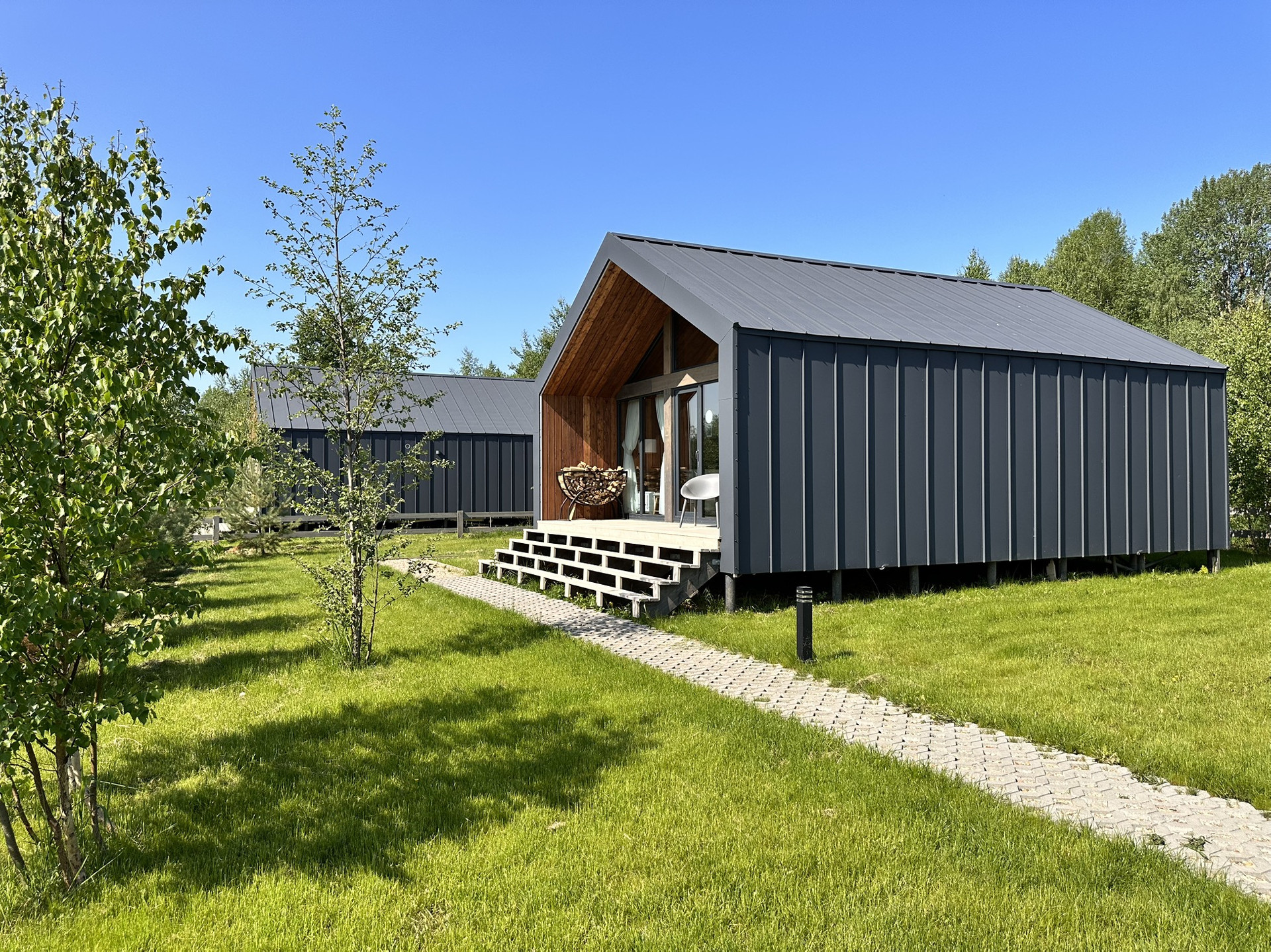 Дом Barn построен на участке 6,2 соток. Площадь застройки 55 кв.м. Дом 43 кв.м. + 12 кв.м. терраса. Одна изолированная спальня, кухня-гостиная, санузел, терраса, своя парковка. Участок засажен соснами.