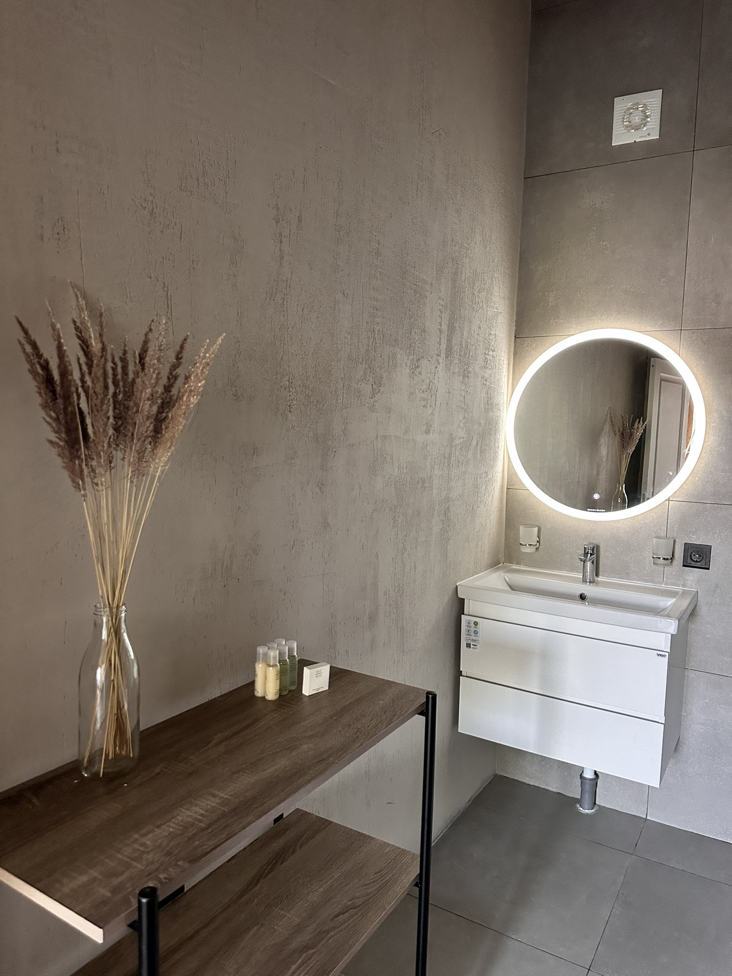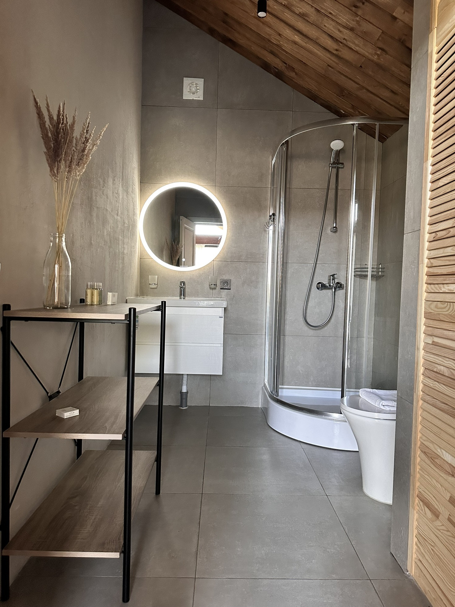 Фундамент на винтовых сваях СВСН  108 / 300 / 3500. Для каркаса использовали дерево хвойных пород. Стены толщиной 150 мм, без учета внешней и внутренней отделки, состоящие из минеральной ваты толщиной 150 мм 35-45 кг/м3. Внешняя отделка фальц панель, цвет RAL 7024, торцевая стена - имитация бруса 135х21 мм. Внутренняя отделка имитация бруса 135х21 мм, ГКЛ, штукатурка декоративная, покраска стен. Внутри установлены межкомнатные двери серого цвета. В ванной комнате на стенах керамогранит 600х600 мм. Входные двери двухкамерные стеклопакеты, рама/профиль RAL 7024 (70 мм), от компании Оконный континент, предоставляющей бессрочное сервисное обслуживание. На полу доска 110х21 мм, утеплитель  минеральная вата толщиной 200 мм 35-45 кг/м3. Панорамное остекление двухкамерные стеклопакеты, рама/профиль RAL 7024 (70 мм) от компании Оконный континент, предоставляющей бессрочное сервисное обслуживание.