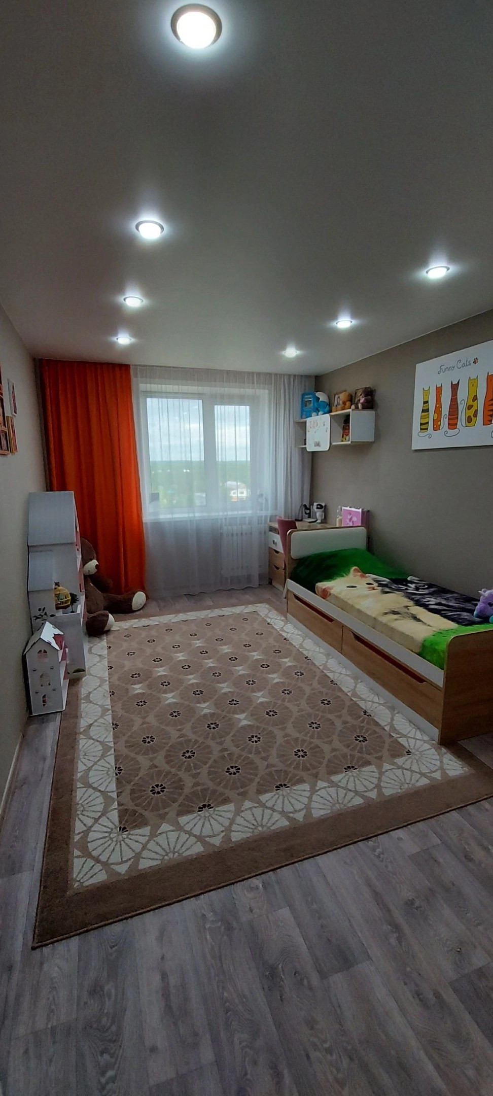 В зале оставляем горку, новая в использовании около года всего, могу оставить шторы (шили на заказ).