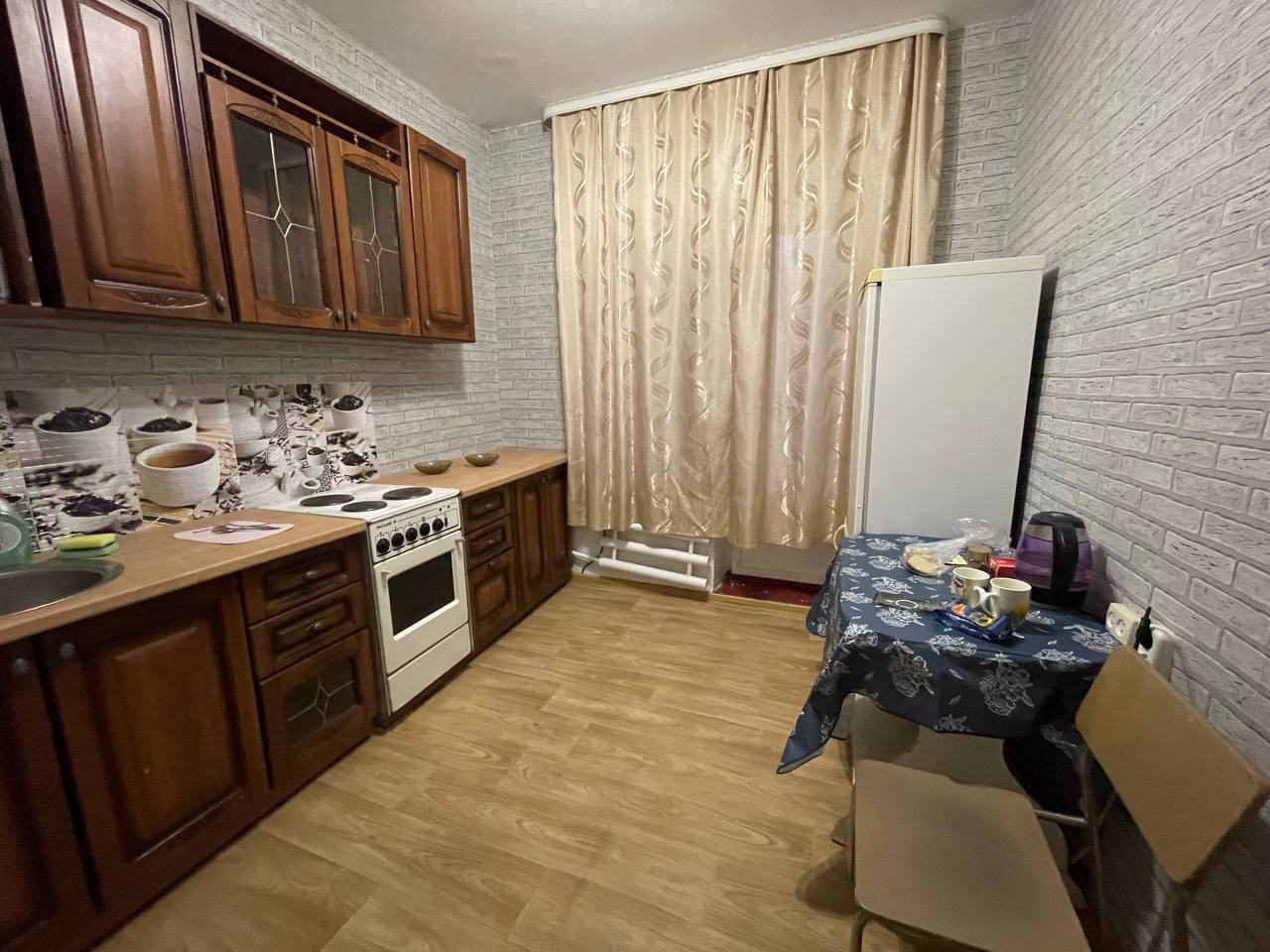 В квартире остается кухонный гарнитур, плита, холодильник.