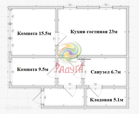 ✔️ Планировка дома включает: две жилые комнаты 15.5/9.5 кв.м, кухню-гостинную 23 кв.м, коридор, санузел 6.7 кв.м с теплыми полами, кладовая 5.1 кв.м