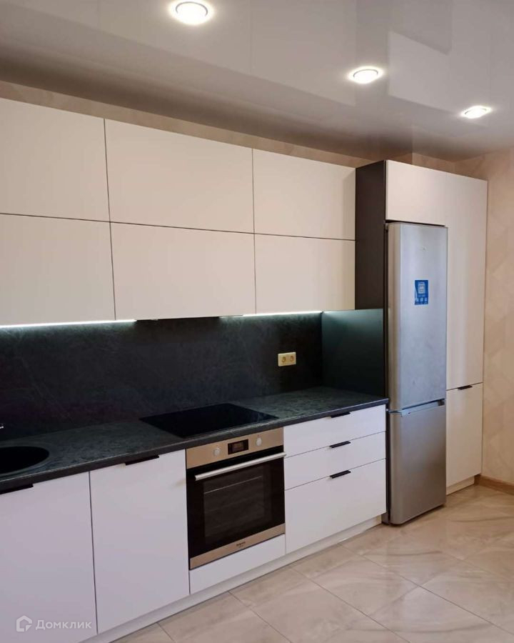 Кухня 13 кв.м. с выходом на лоджию. Сама лоджия с теплым полом и панорамным остеклением. Встроенная кухня: холодильник, варочная электрическая панель, духовой шкаф электрический, вытяжка, столешница и мойка из искусственного камня.