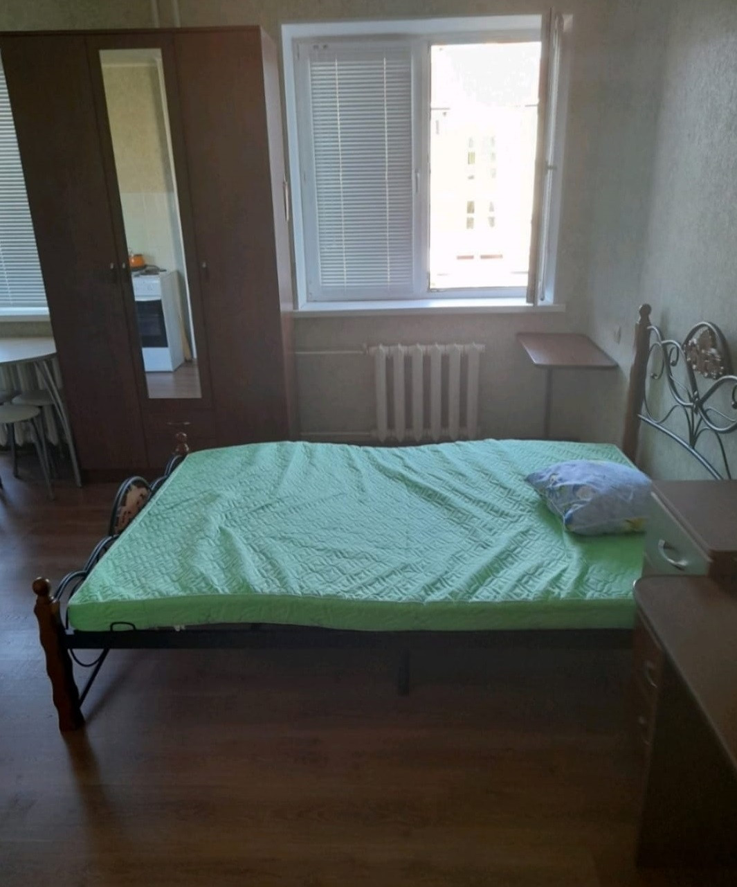 В одном из самых освещенных, просторных и тихих районов продается уютная, теплая, светлая и практичная квартира-студия (средний этаж), полностью укомплектована техникой и мебелью. Квартира с балконом, окна выходят во двор.  Квартирка с косметическим ремонтом (на полу ламинат в жилой и плитка во входной зонах, окна ПВХ,  натяжной потолок, в ванной панели, вся сантехника новая балкон с остеклением, на кухне фартук в кафеле), можно заехать и жить. В микрорайоне есть все: новый детский садик, школа, центры развития, аптеки, магазины, ООТ рядом с домом в любую сторону. При этом он все больше и больше развивается. Отличные дороги, парковки, возможность спокойно прогуливаться (вечером тихо и очень красиво). Во дворе детская площадка.  Соседи спокойные, доброжелательные. Данная квартира очень удобна своей планировкой и возможностью изолировать кухню от комнаты и сделать отличную отдельную прихожую. Один взрослый собственник, рассмотрим любую форму оплаты и торг. Цена ниже средней по району.