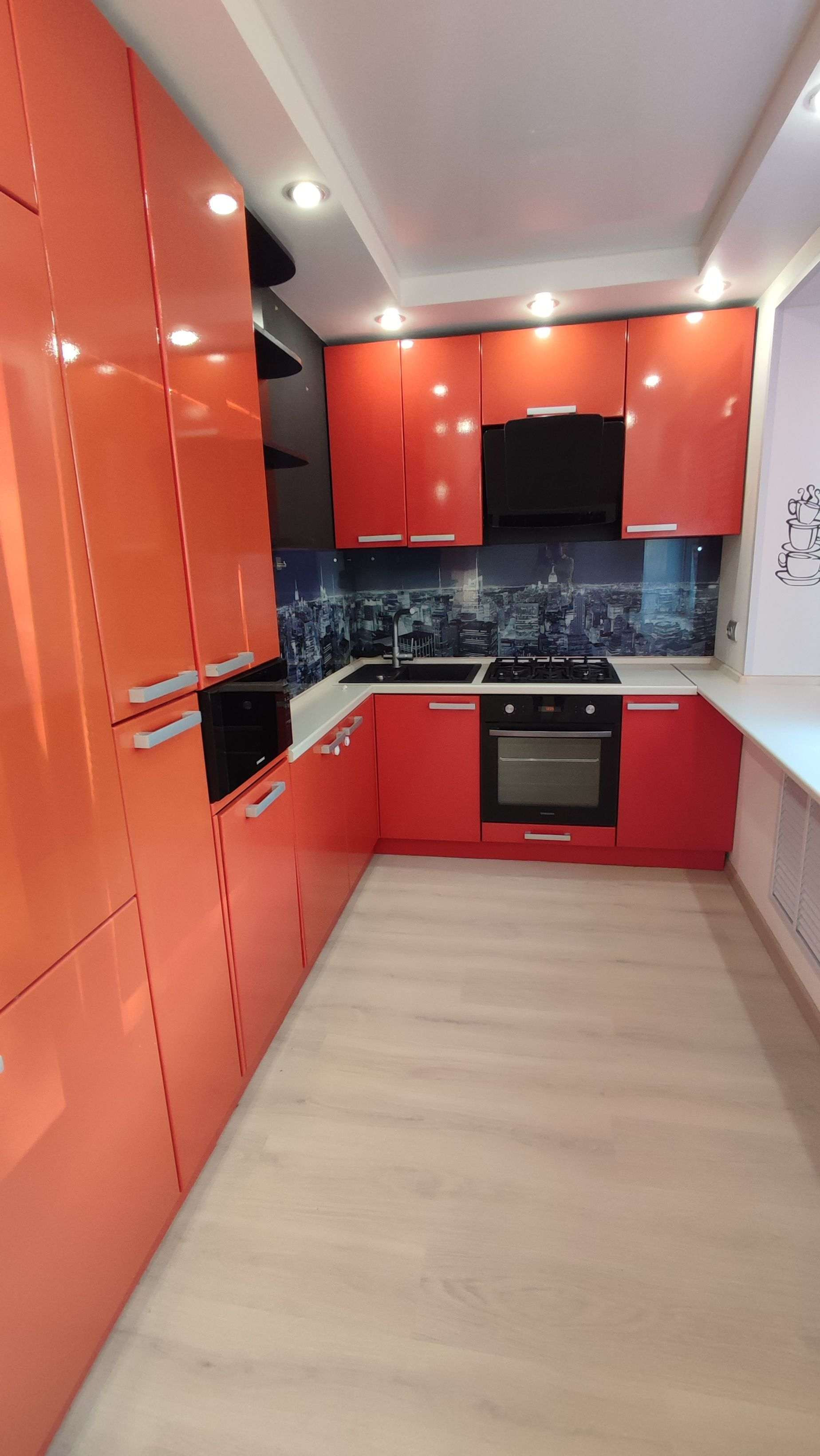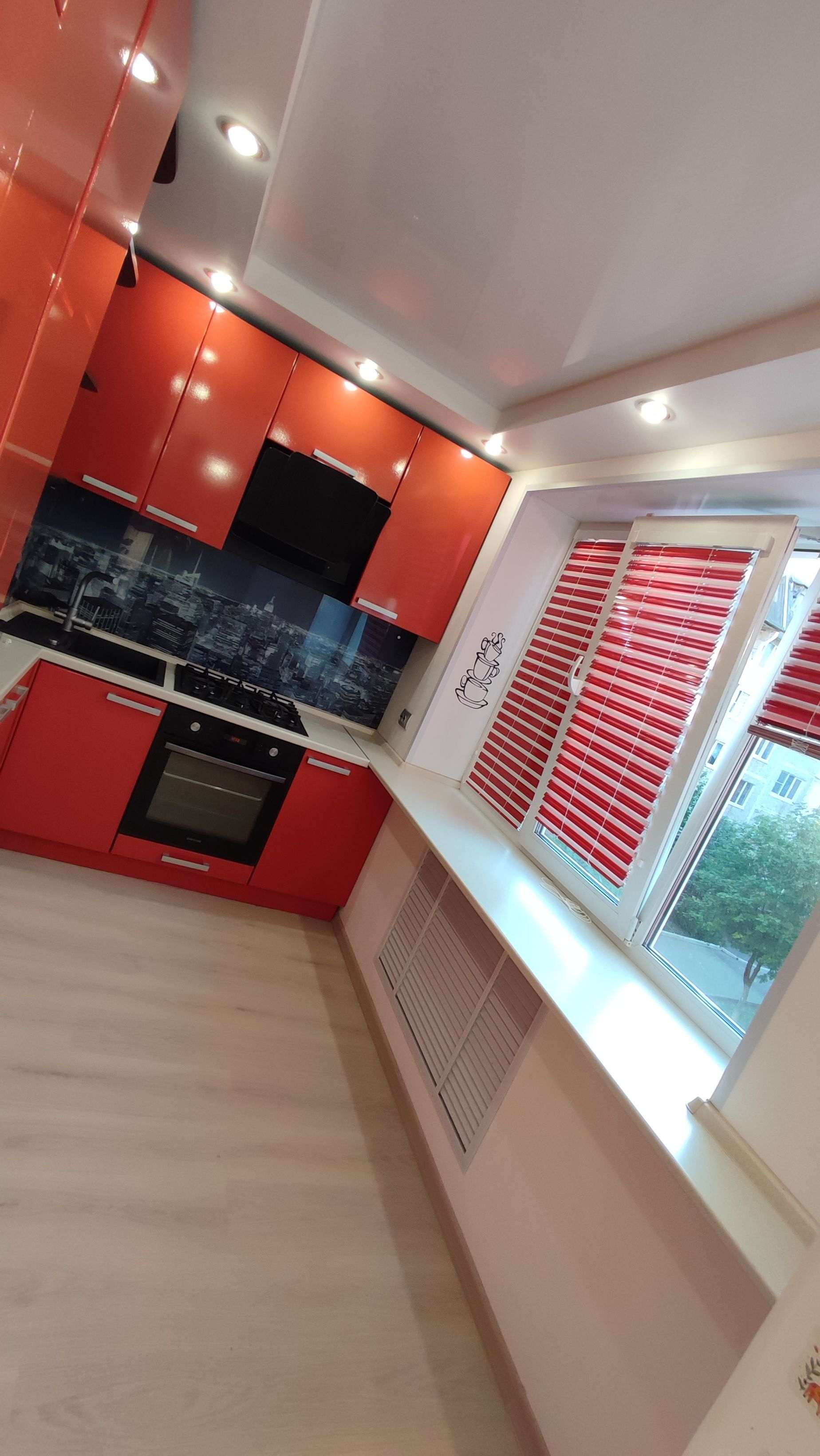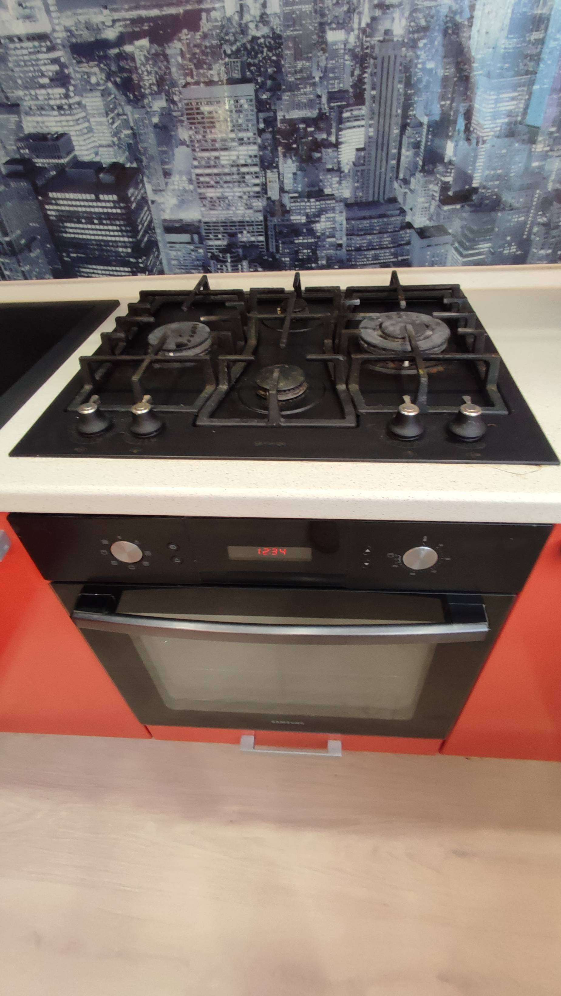 * кухня-столовая 18.9м2 с выходом на балкон (кухонный гарнитур, наличие техники - духовой шкаф Samsung, газовая поверхность Gorenje, вытяжка Ariston, посудомоечная машина Ariston, СВЧ Samsung)