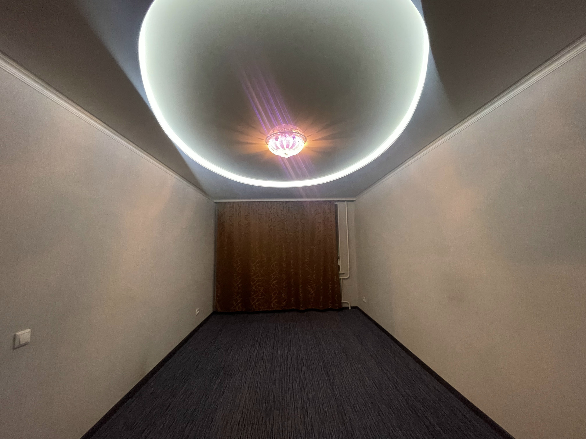 В комнате сделана хорошая косметика: выровнены стены, двухуровневый потолок, ковролин на полу.
