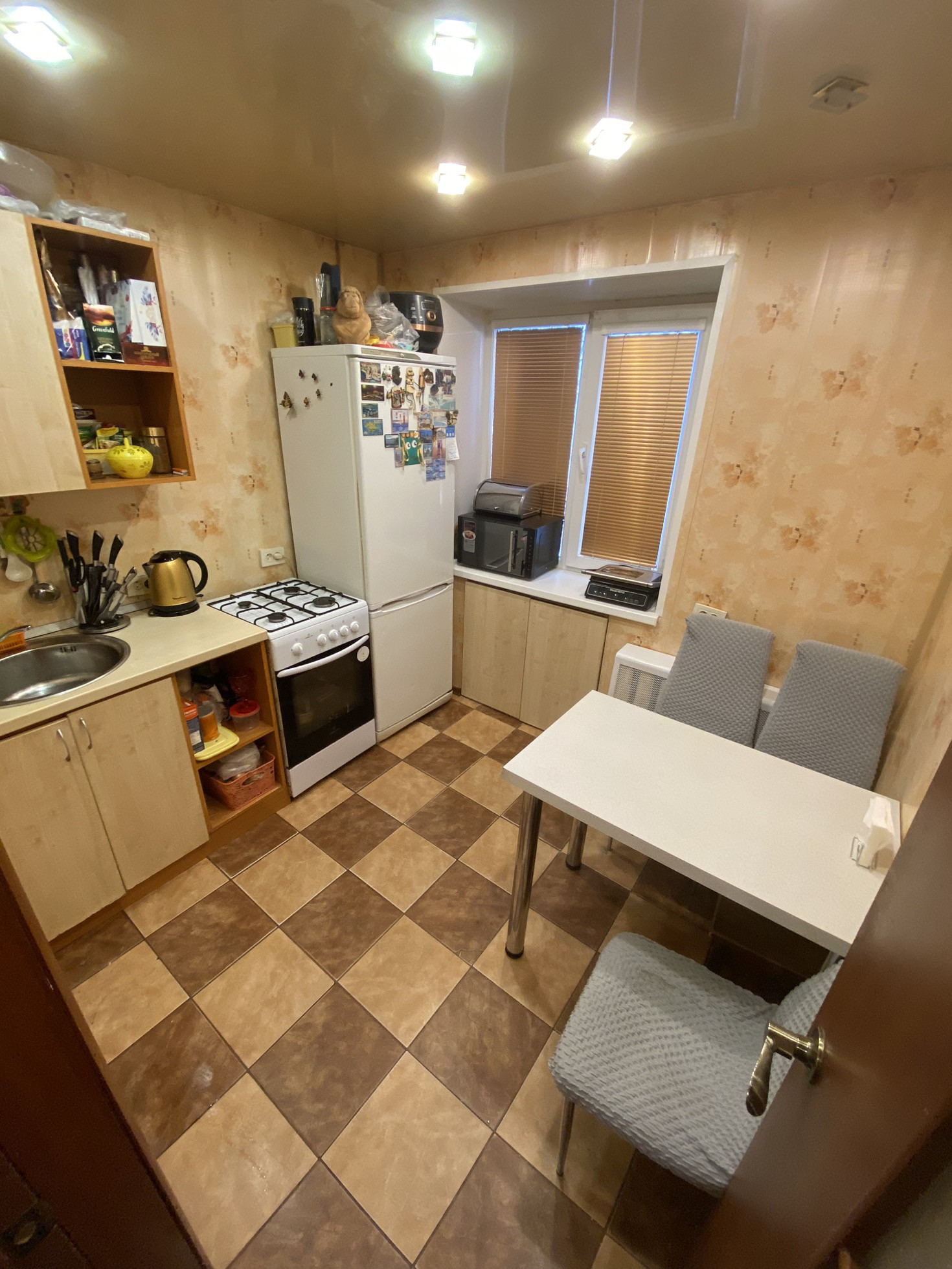 -полы ламинат,кухня кафель.