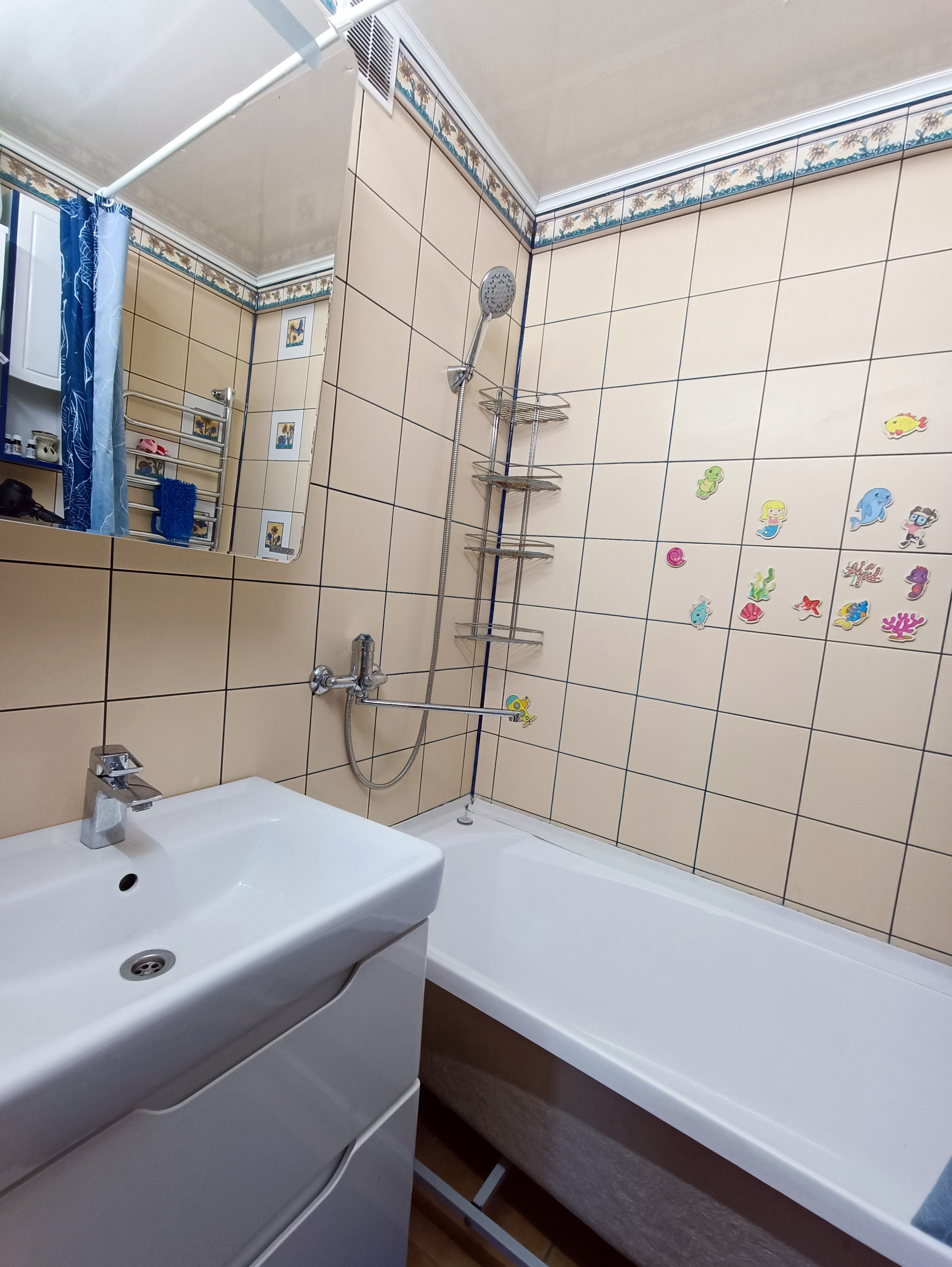 На стенах в ванной кафель, полы с подогревом, сама ванна акрил;