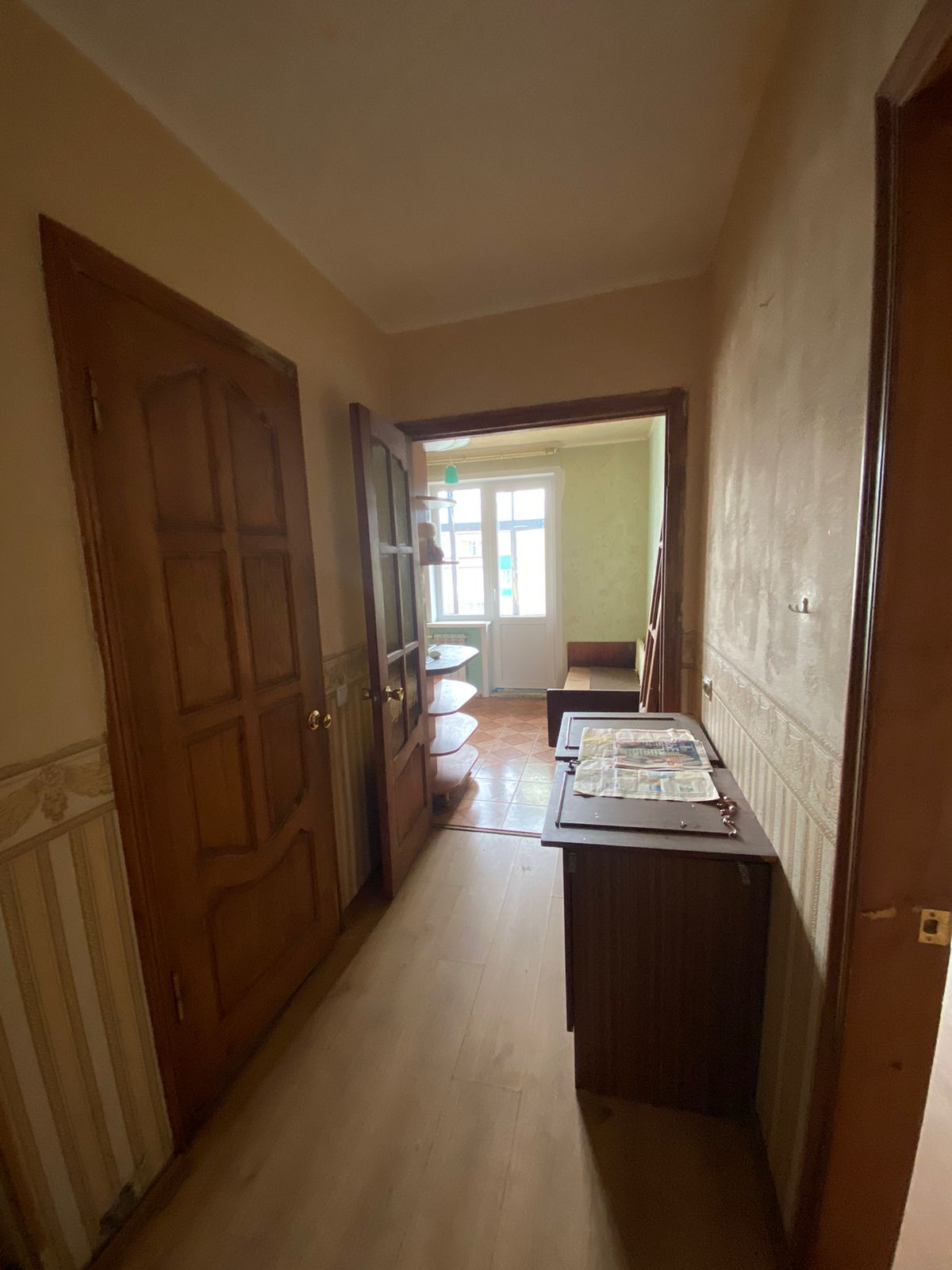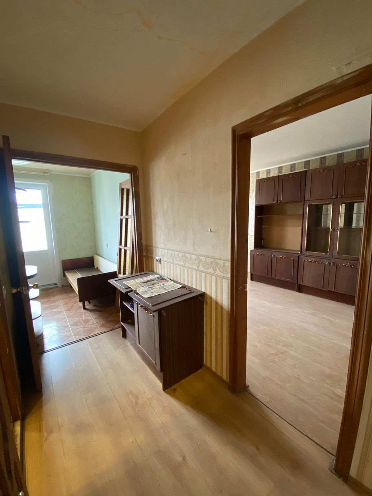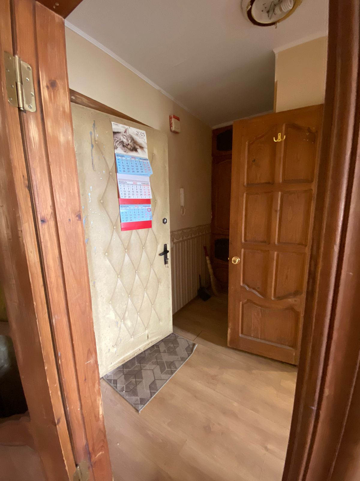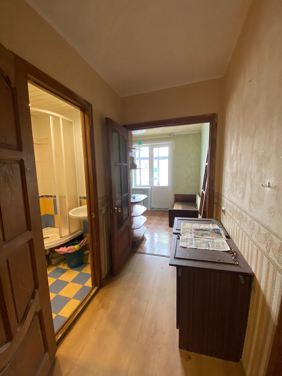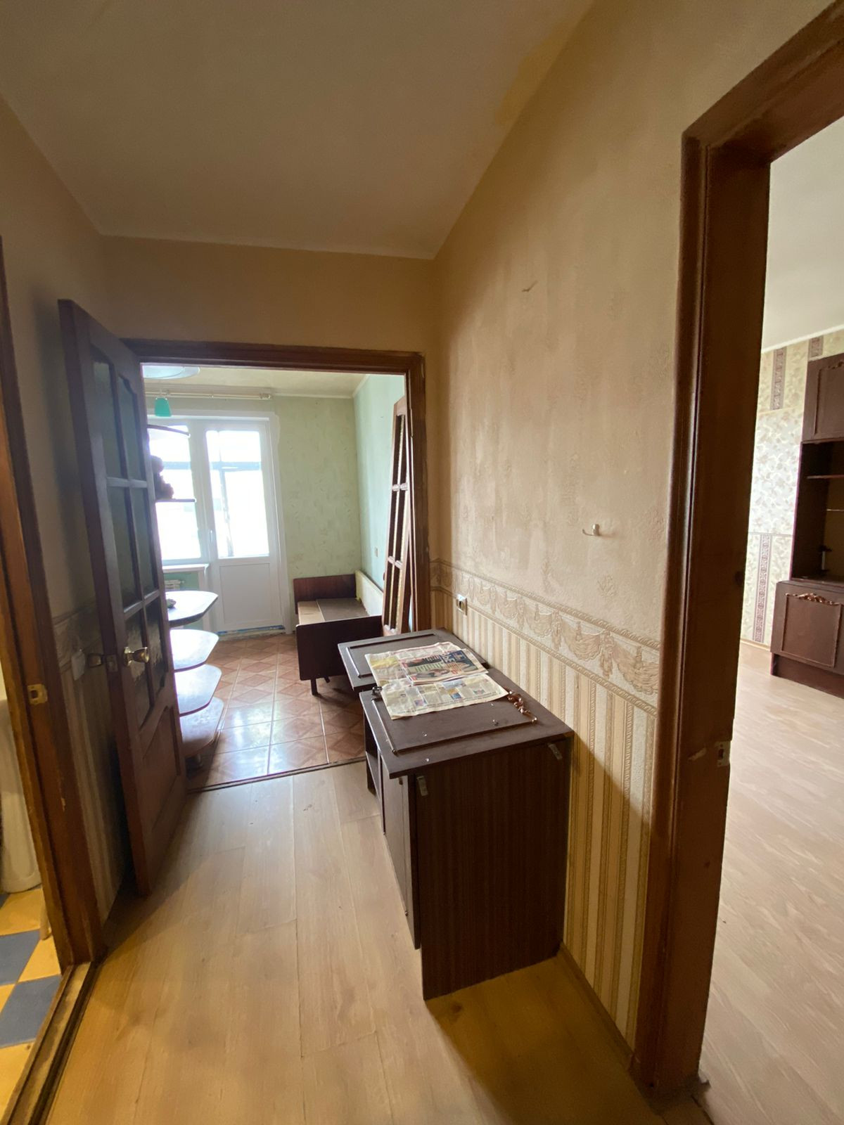 Жилая площадь составляет 17.5 квадратных метров, а кухня — 9 квадратных метров. В квартире имеется балкон, откуда открывается вид на тихий и ухоженный двор. Санузел совмещённый, что является удобным решением для экономии пространства.