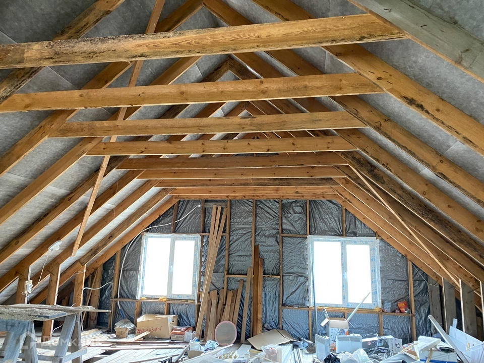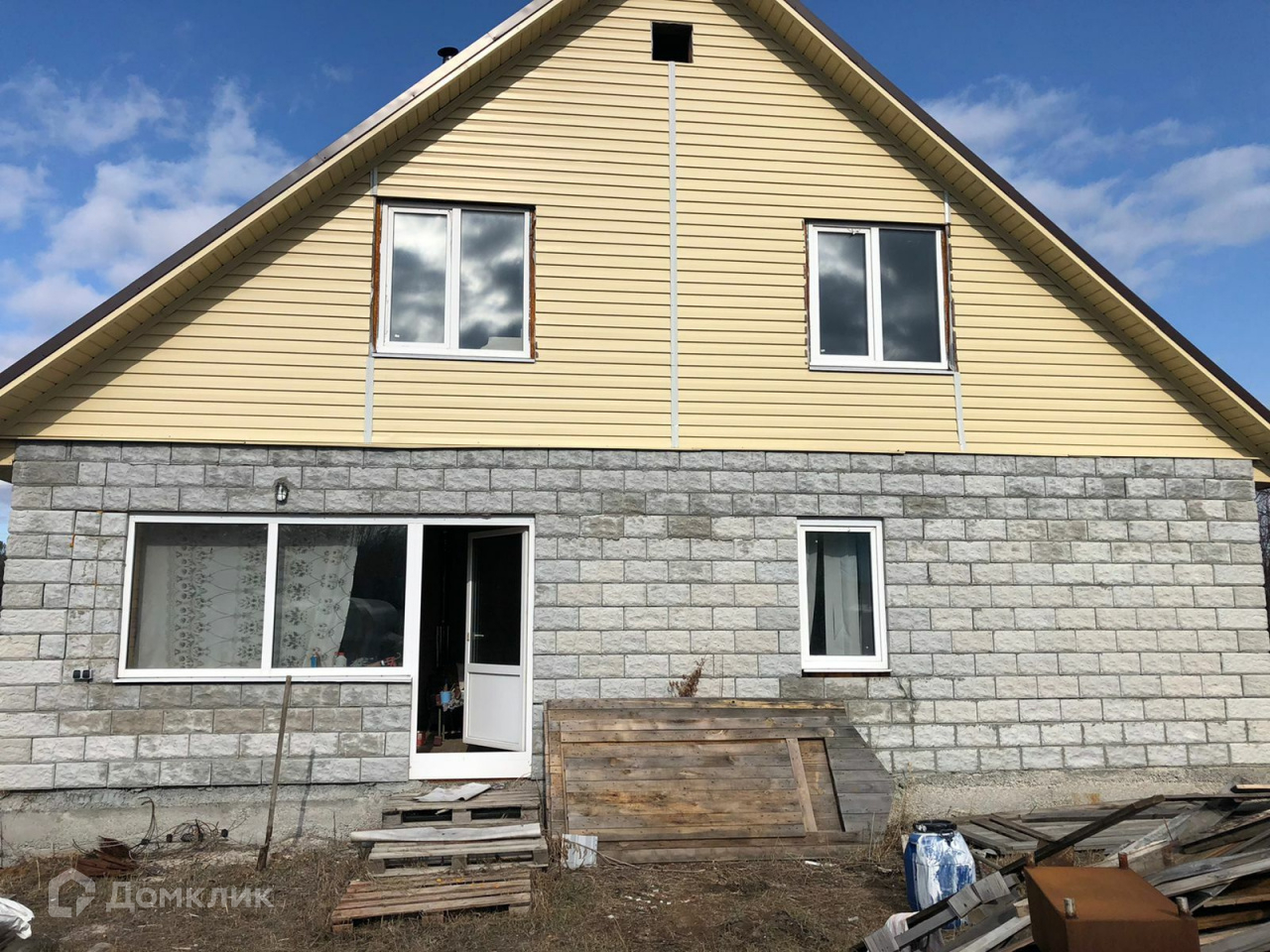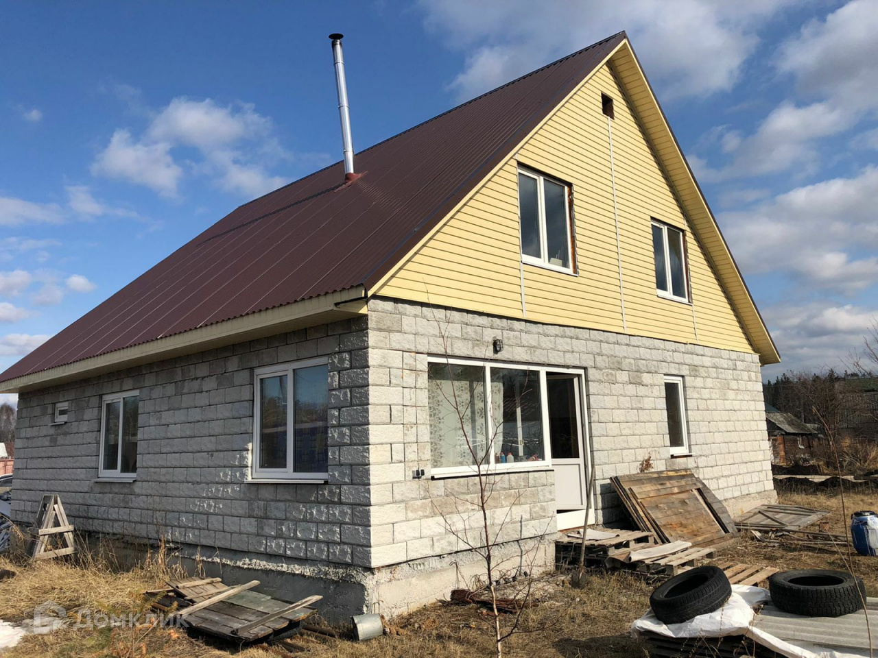 Фундамент-  монолитный железобетонный ленточный, наружные стены и перегодки - пенополистиролбетонные блоки , кровля - металлочерепица. На первом этаже пол и стены - отделка термомодифицированной древесиной, установлена печь-камин, баня и санузел в доме функционируют.