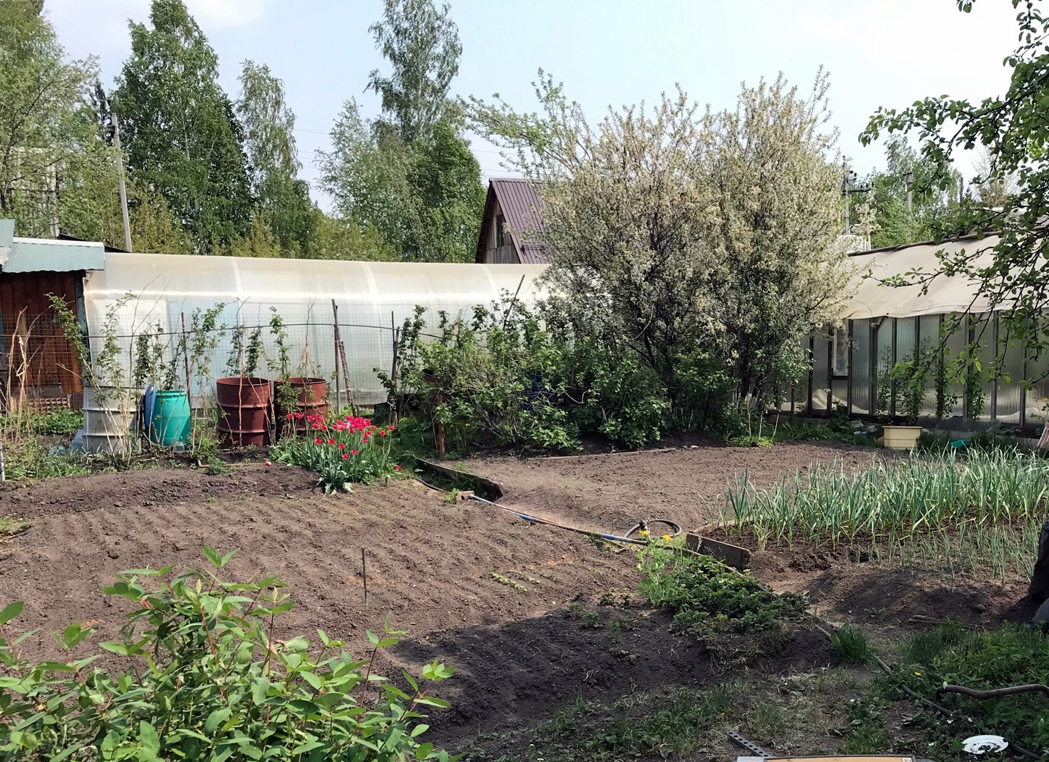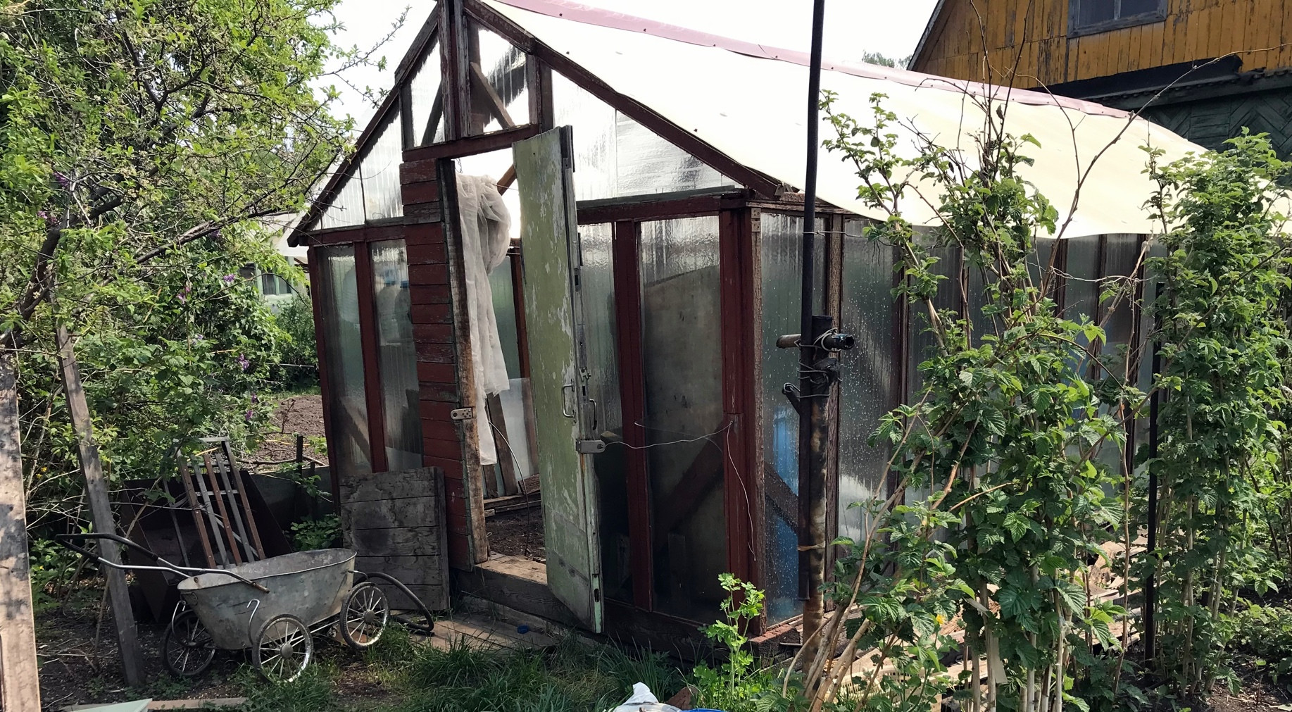 Участок: полностью обработан, множество необходимых насаждений,большая теплица,сарай, туалет.