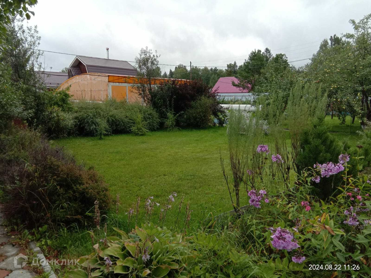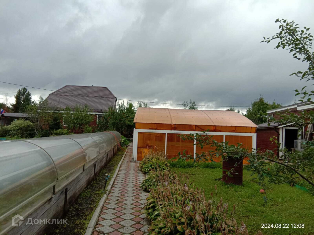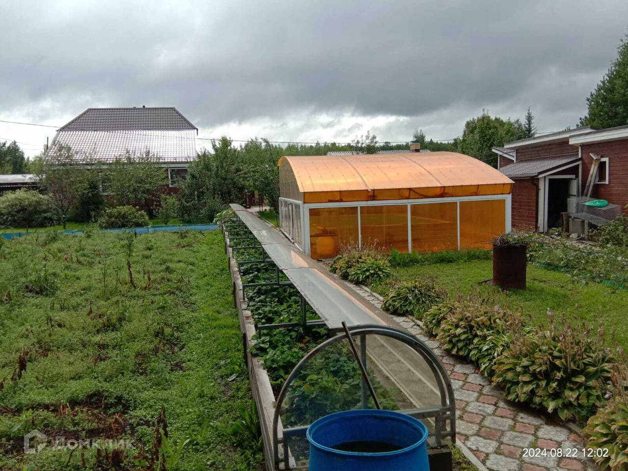 На территории участка много посадок. Это и плодоносящие яблони, туи разных сортов, шикарные розы и много других диковинных многолетних растений. Есть теплицы из ПВХ профиля, клубника растет в специальных парниковых грядках.